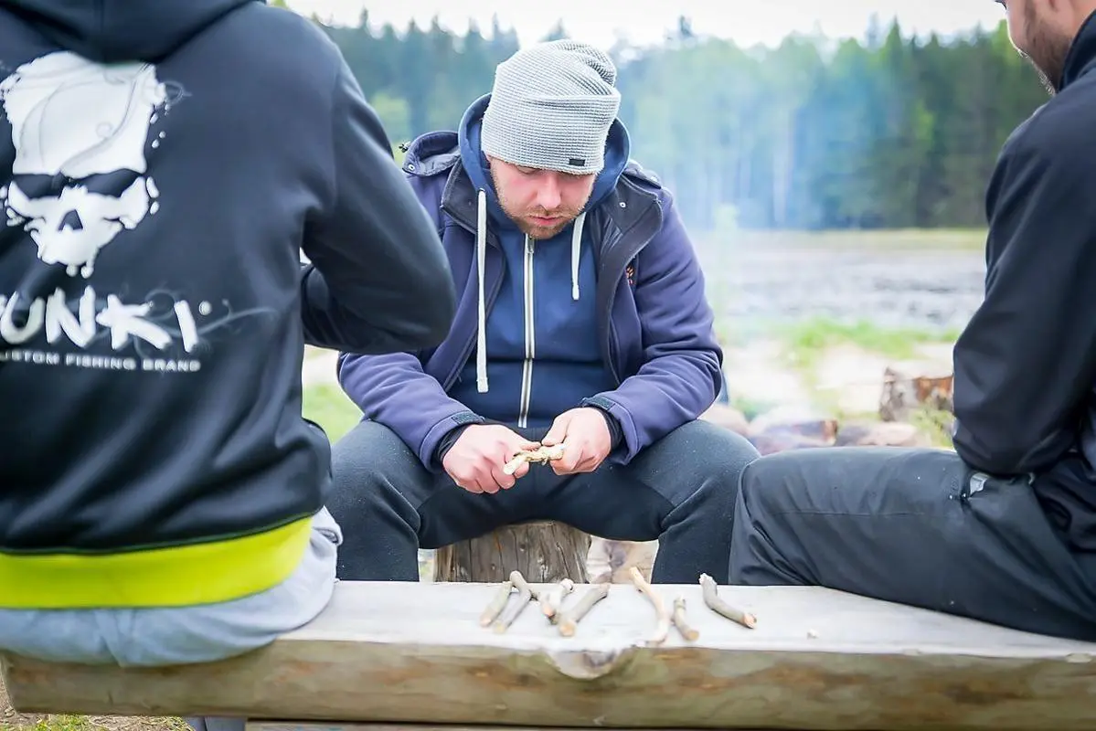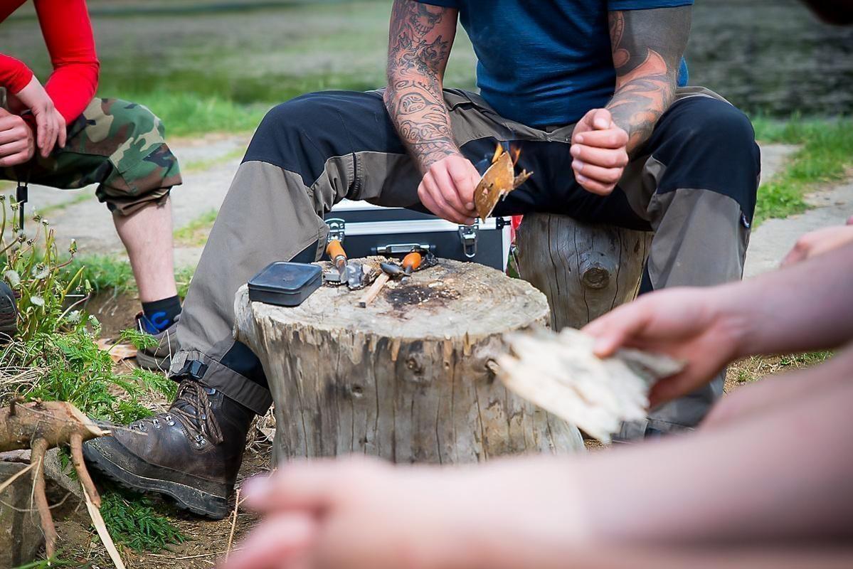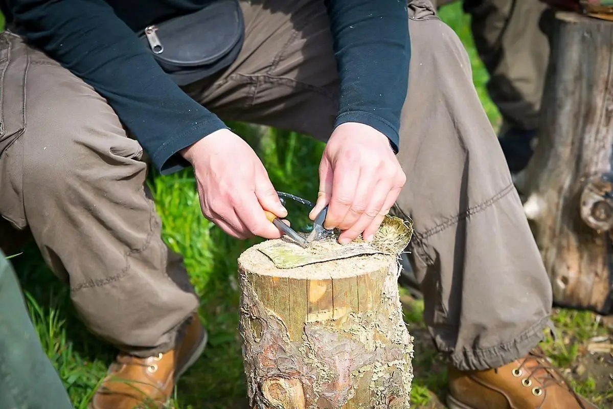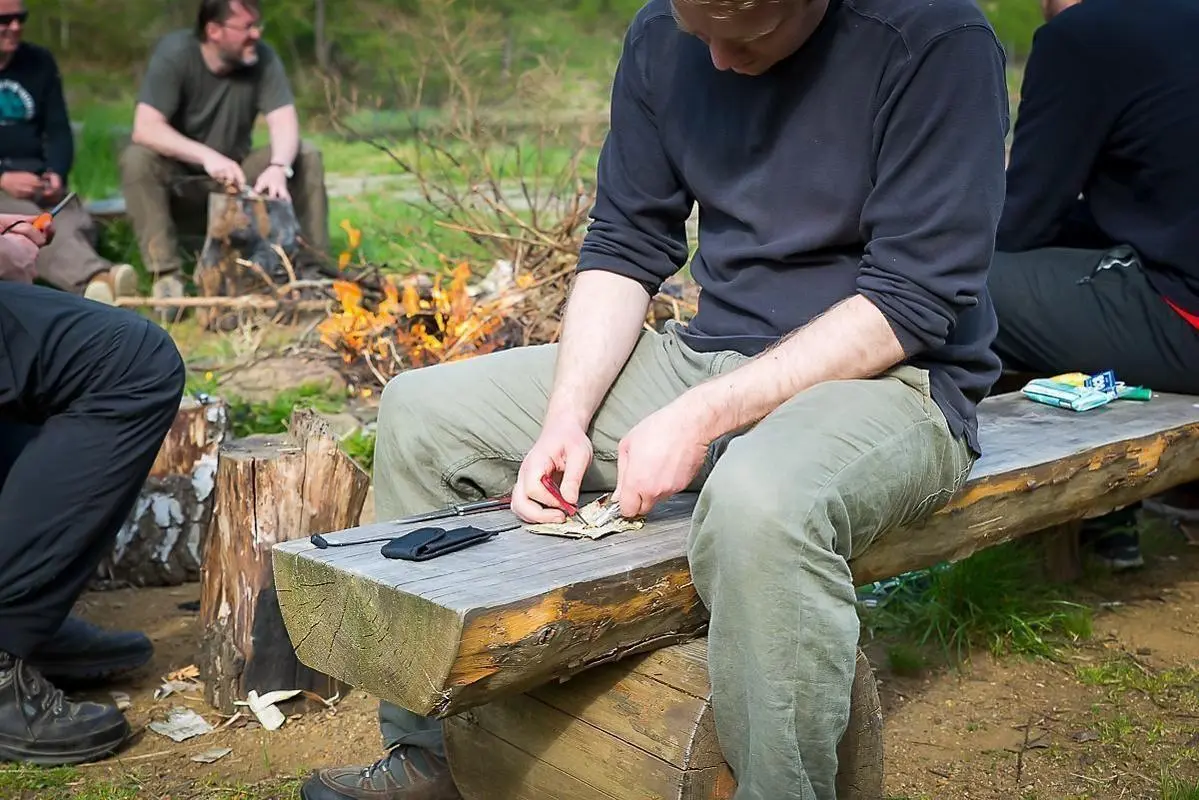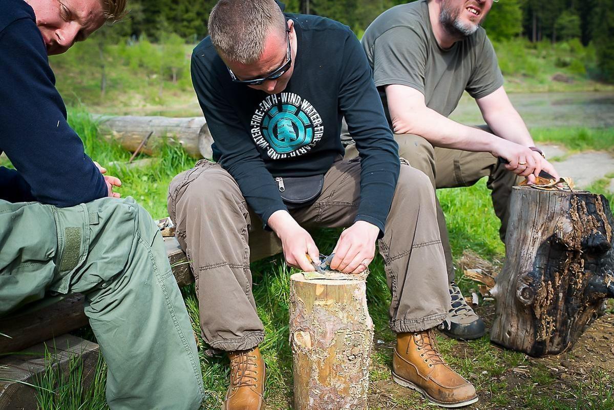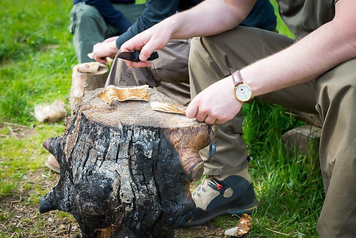 Messer schneidet Zunder auf einem Baumstumpf, während Personen im Hintergrund sitzen