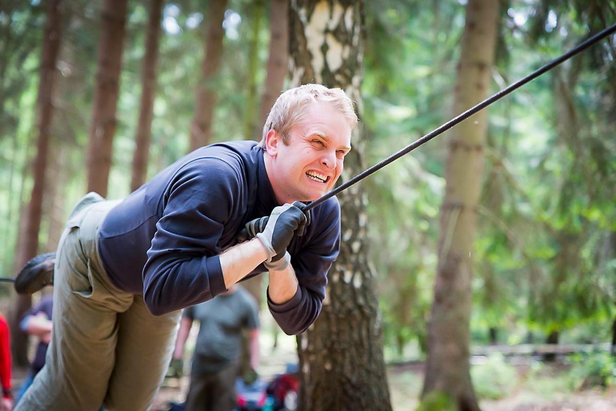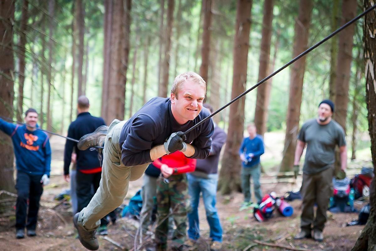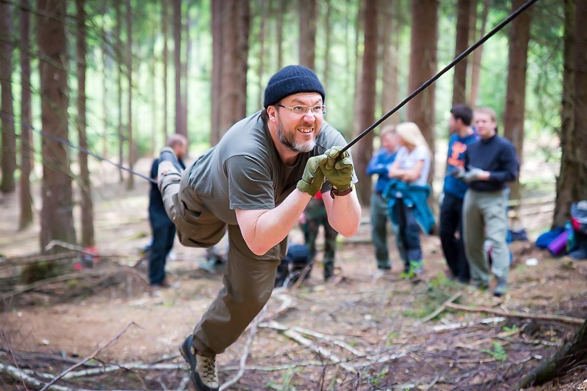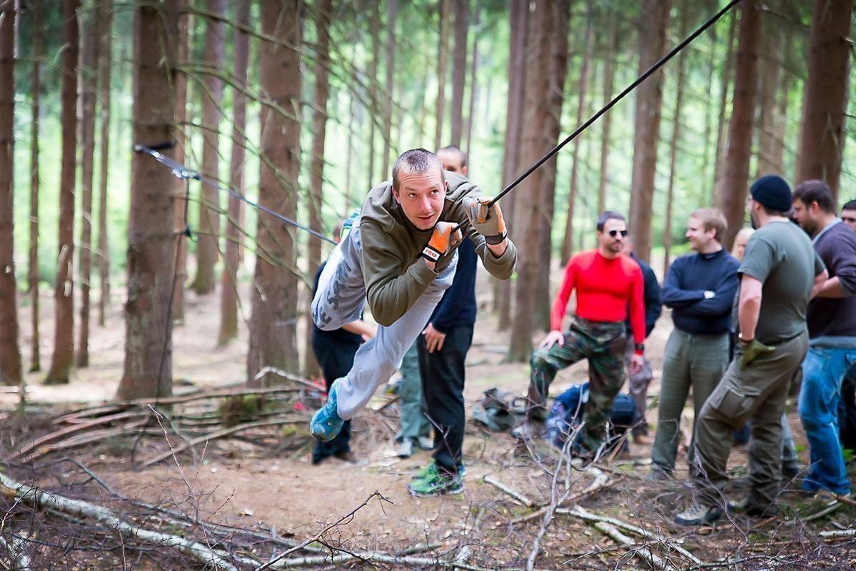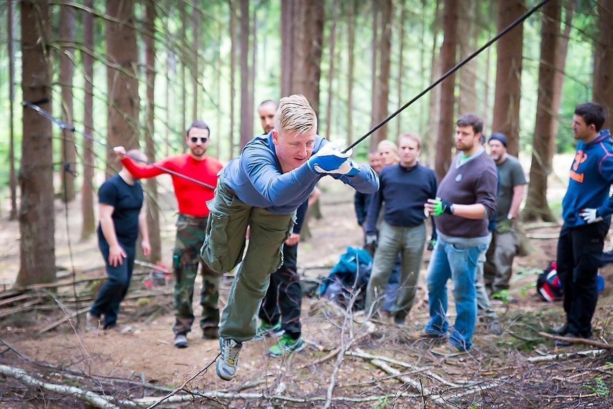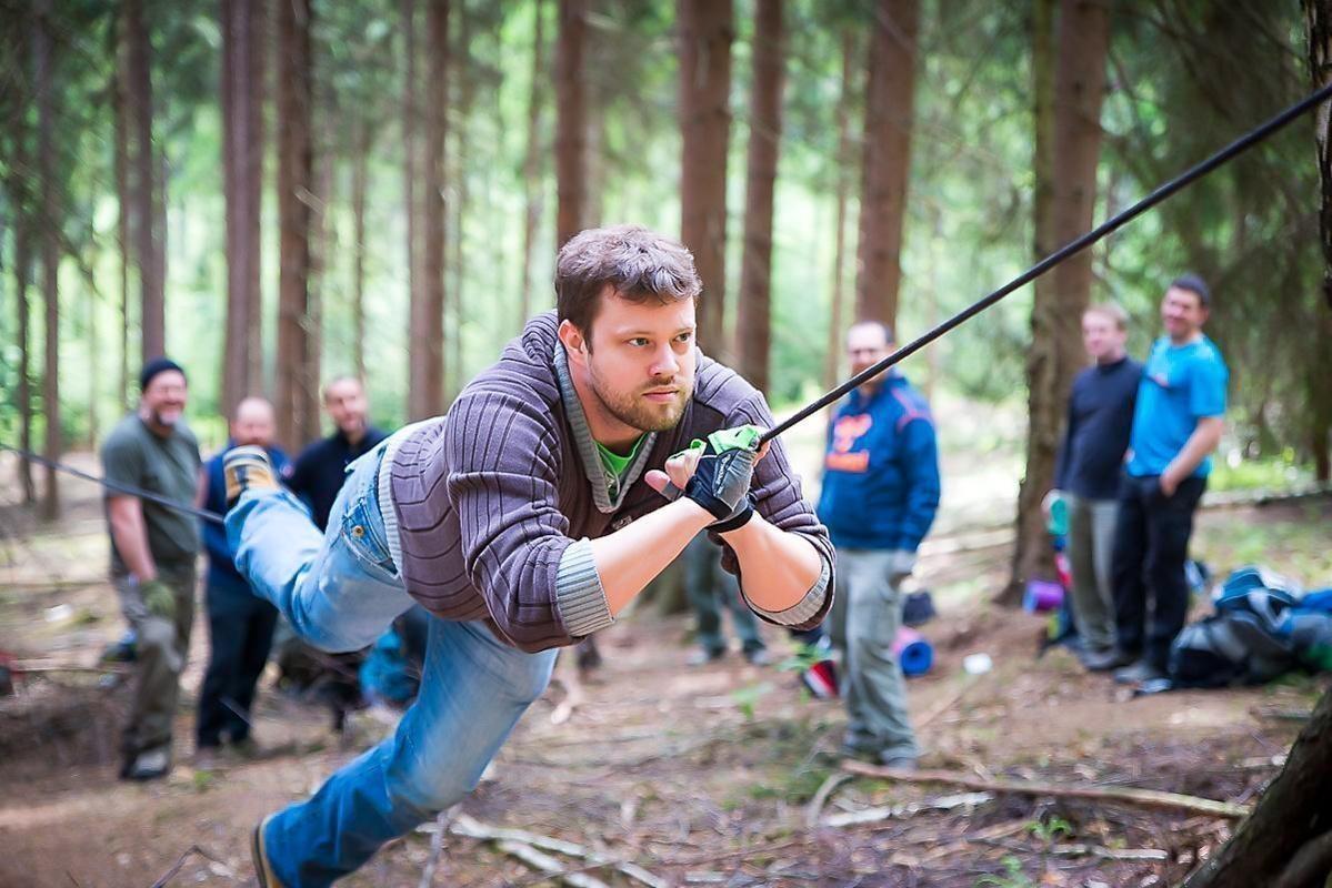 Mann überquert selbstgebaute Seilbrücke im Wald, andere Teilnehmer beobachten