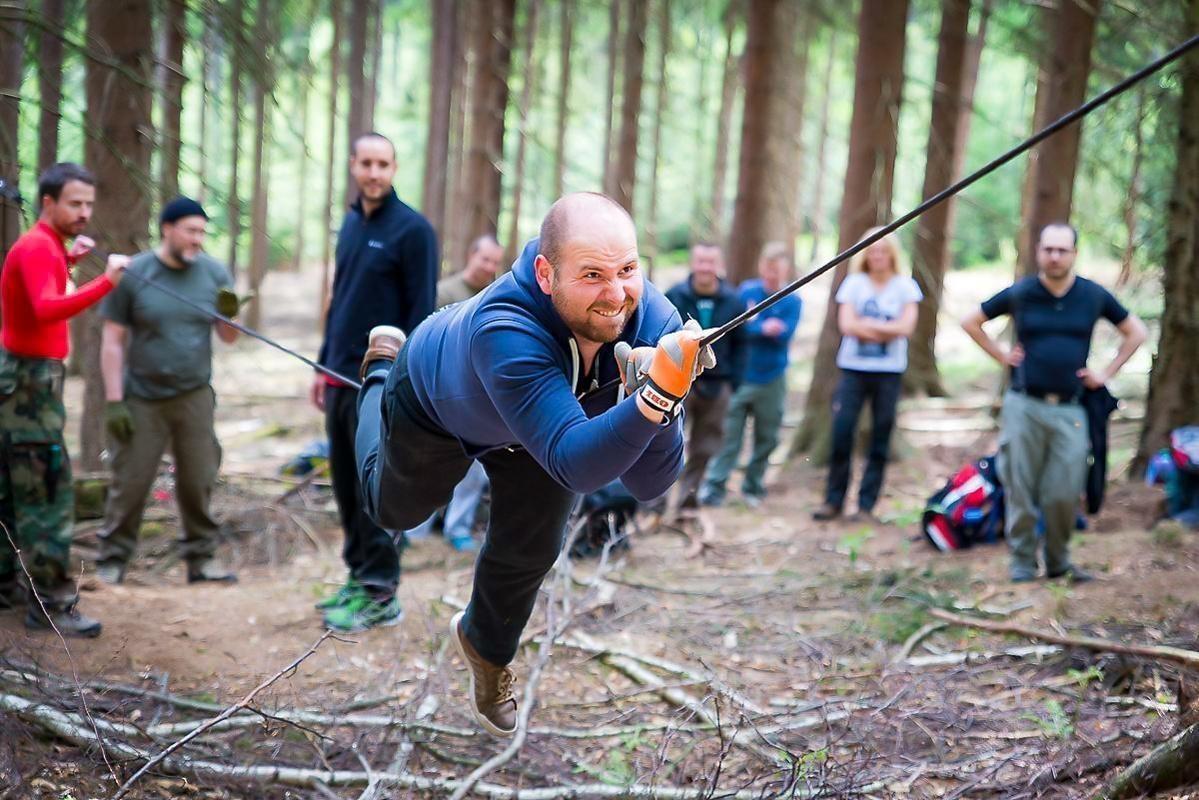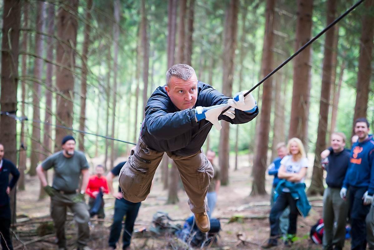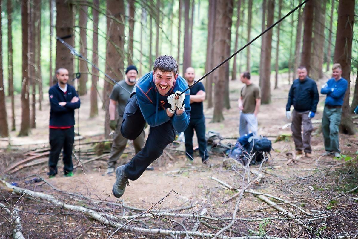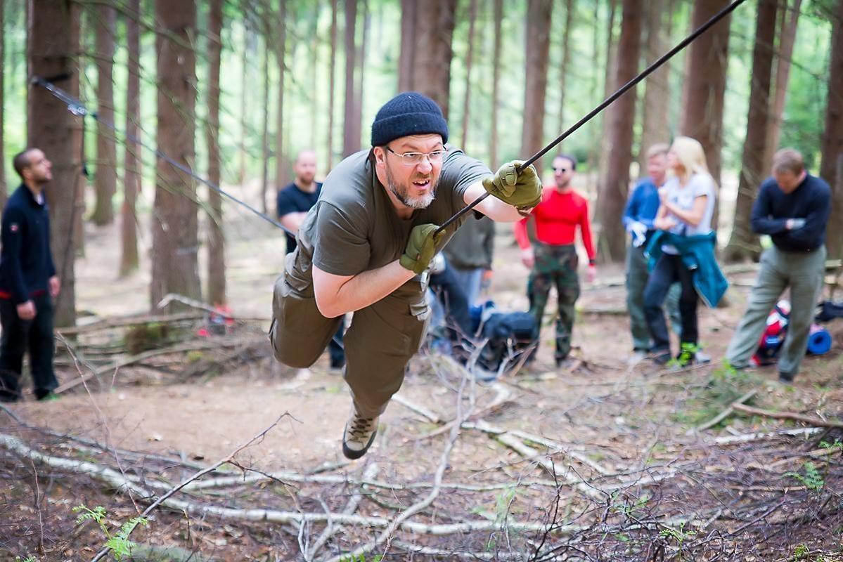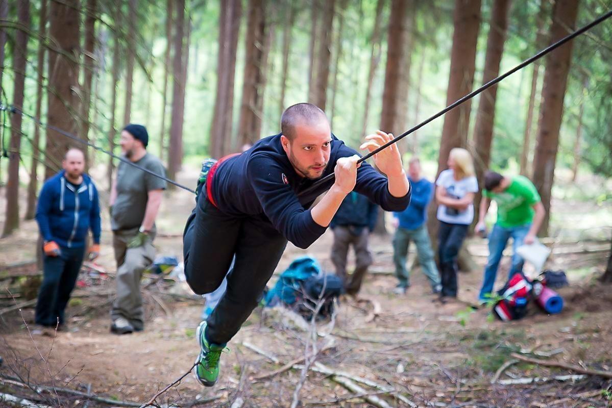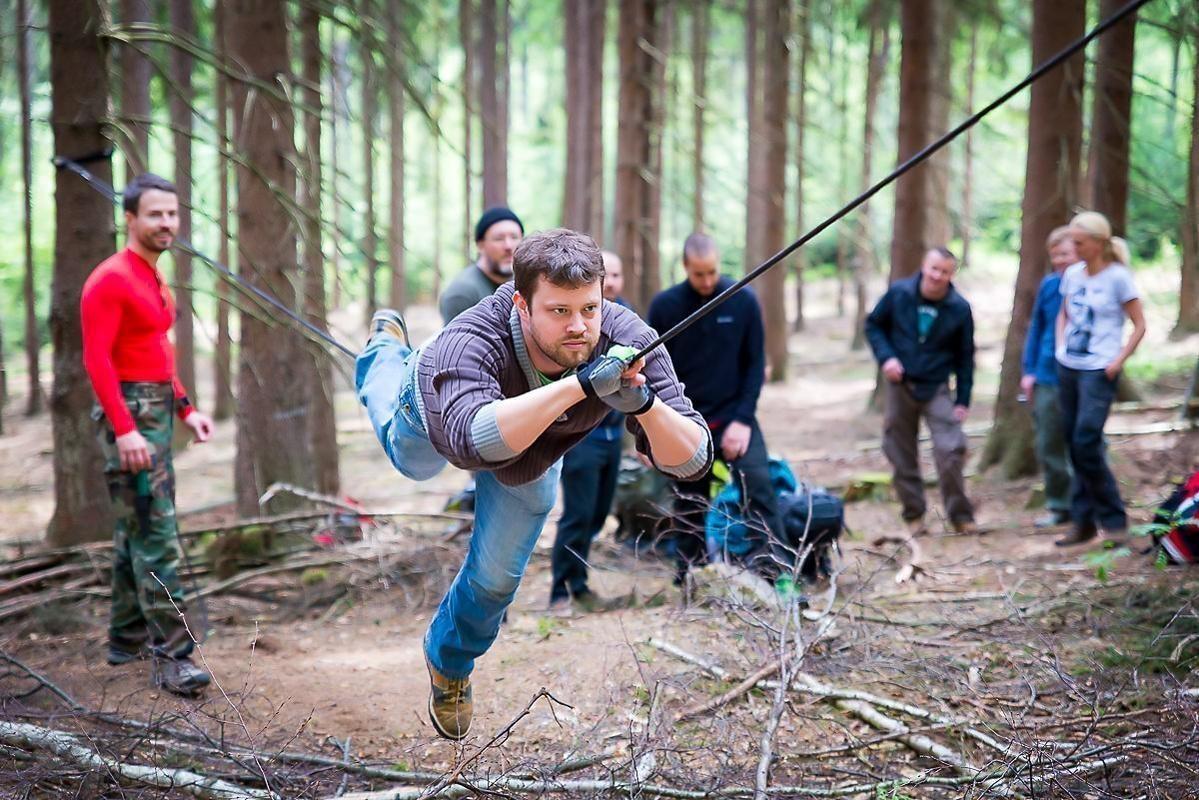 Mann überquert selbstgebaute Seilbrücke im Wald, andere Teilnehmer beobachten