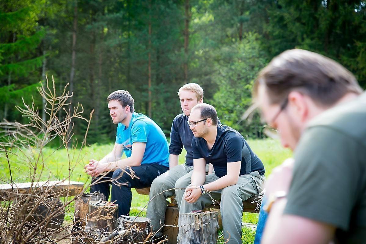 Gruppe diskutiert im Wald, Rucksäcke liegen am Boden