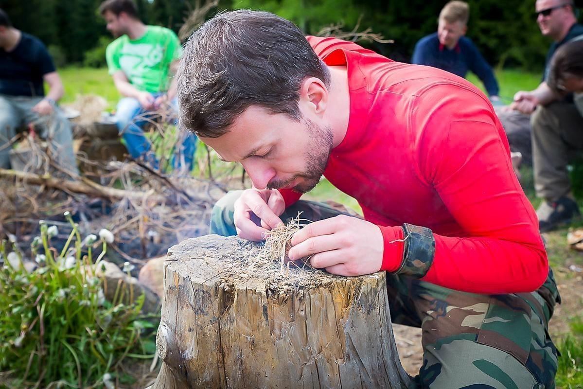 Mann zündet Zunder mit Feuerstahl auf Baumstumpf am Wasser
