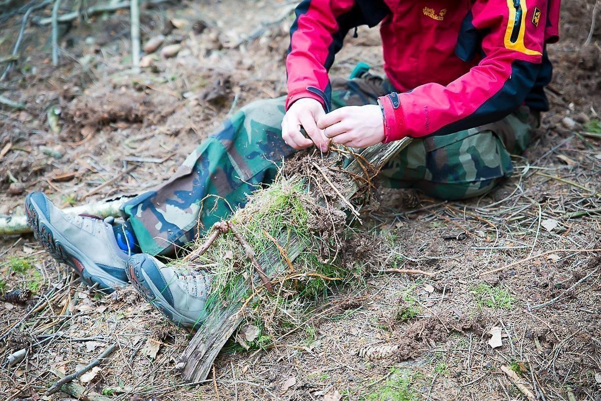 Zwei Personen arbeiten an einer improvisierten Konstruktion aus Ästen und Moos