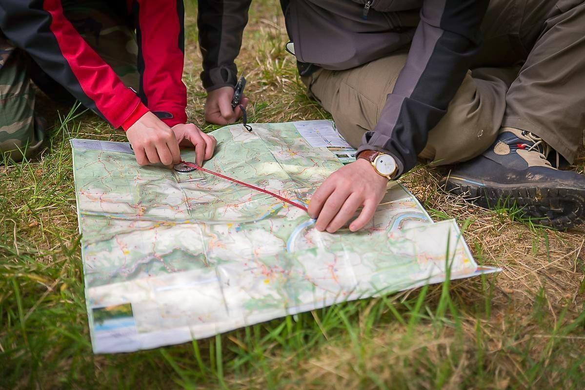 Zwei Hände legen einen Kompass auf eine Landkarte zur Orientierung