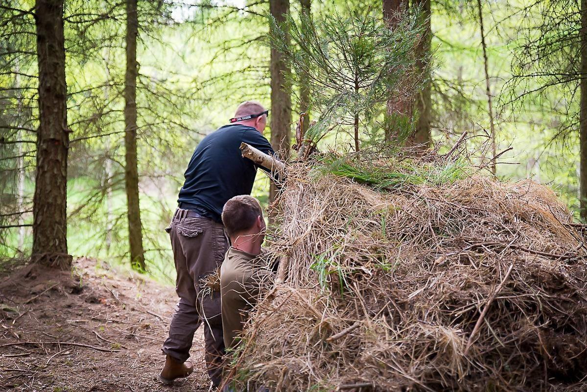 Zwei Personen bauen eine Notunterkunft aus Ästen und Zweigen im Wald