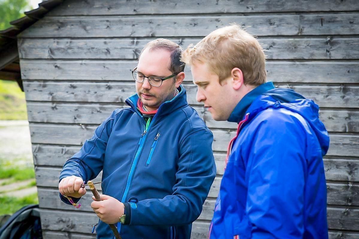 Zwei Personen üben eine Technik mit einem Holzstück in der Natur