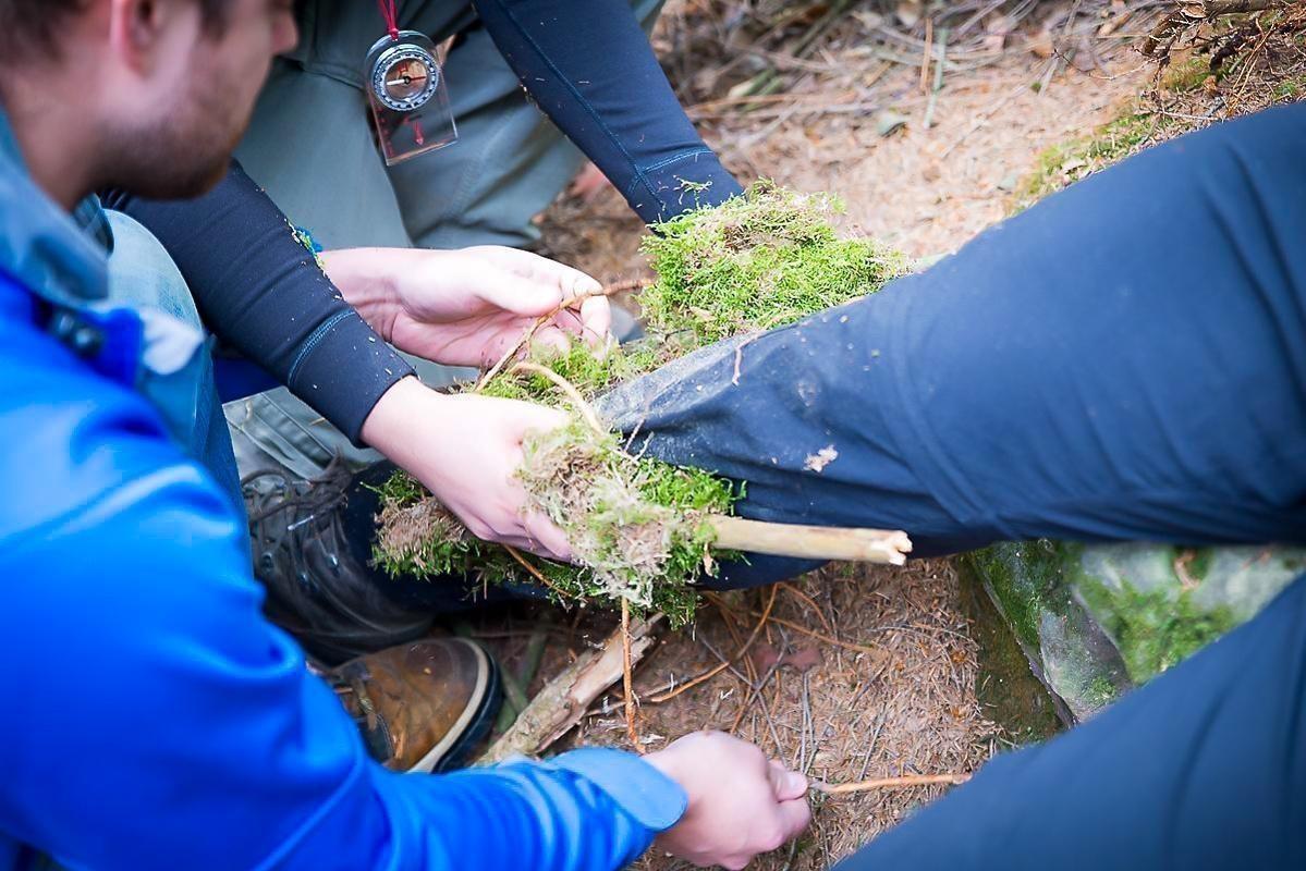 Zwei Personen legen Moos und Äste um ein Bein zur Stabilisierung