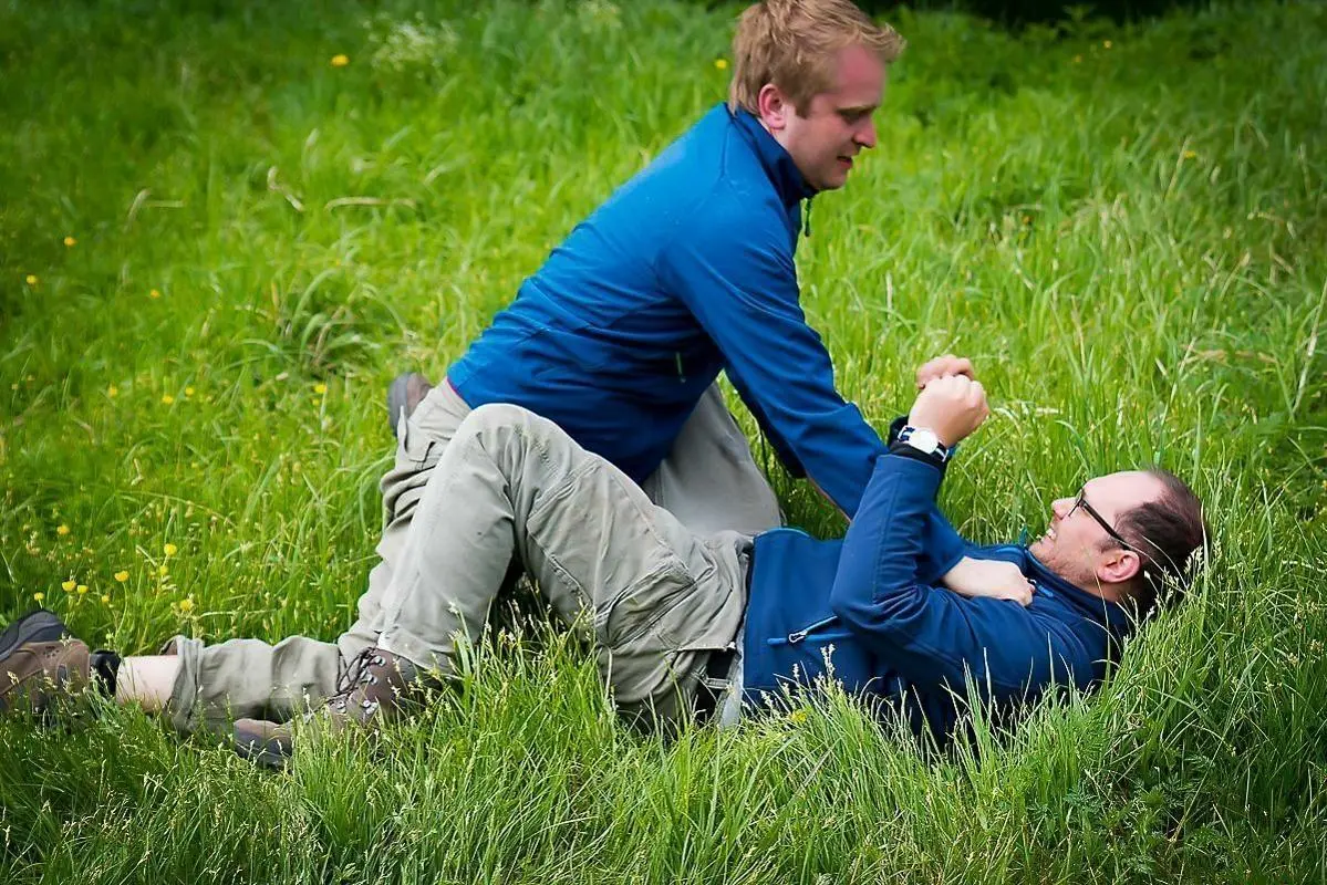 Zwei Personen in Outdoor-Bekleidung üben eine körperliche Auseinandersetzung im Freien