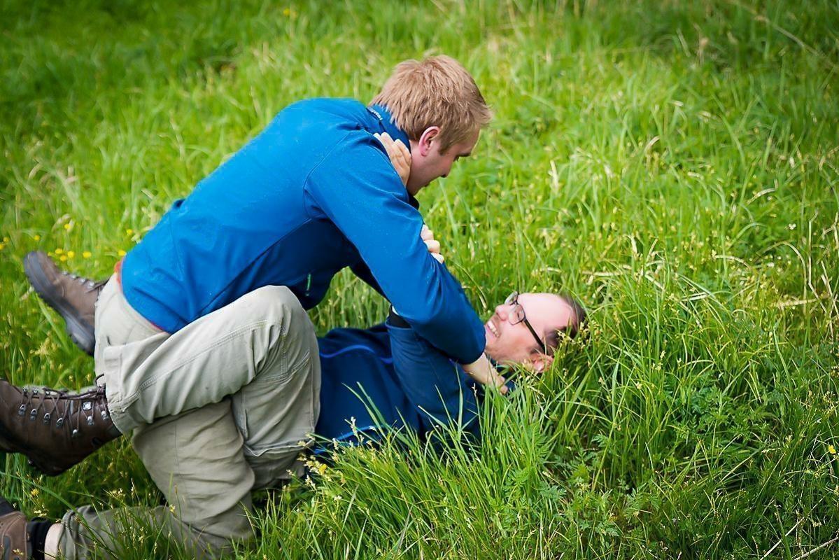 Zwei Personen üben eine Technik im Nahkampf auf einer Wiese