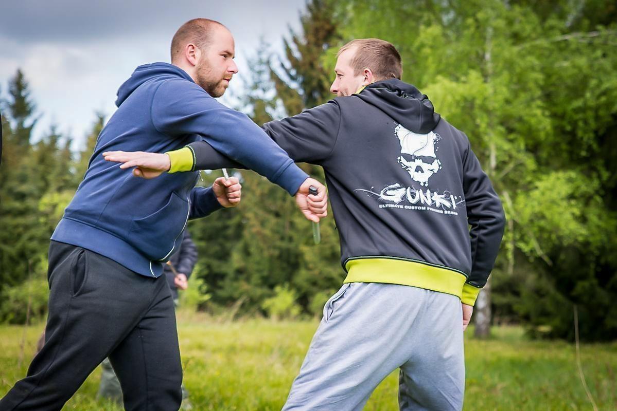 Zwei Personen üben eine Nahkampftechnik im Freien
