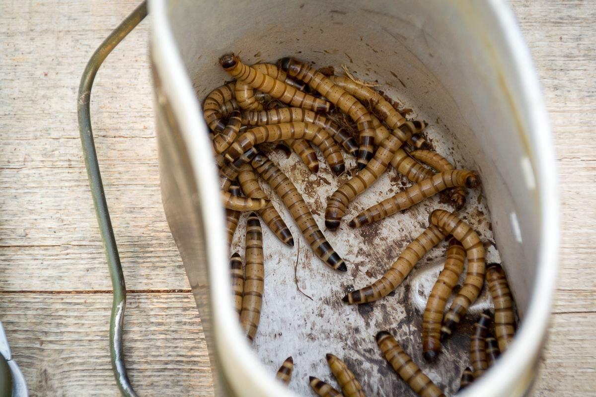 Behälter mit mehreren essbaren Insektenlarven auf Holzuntergrund