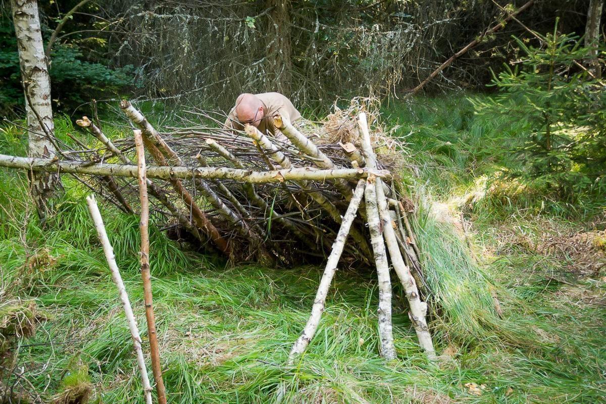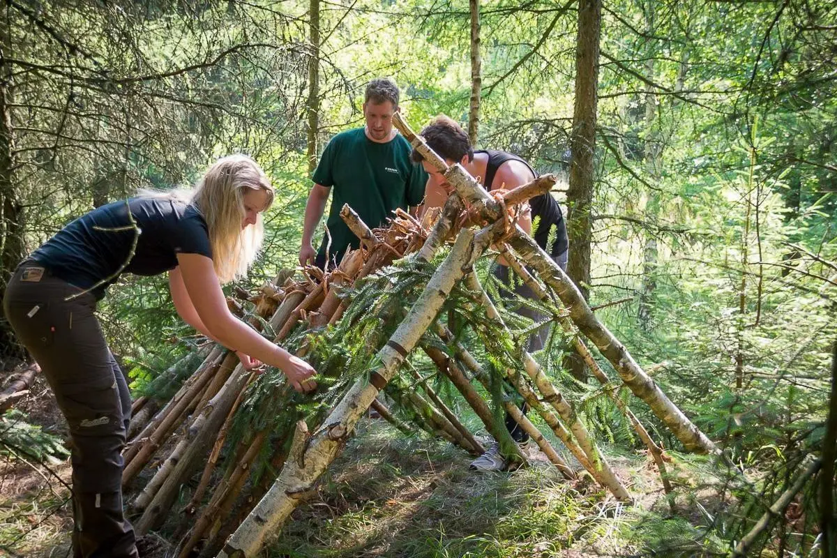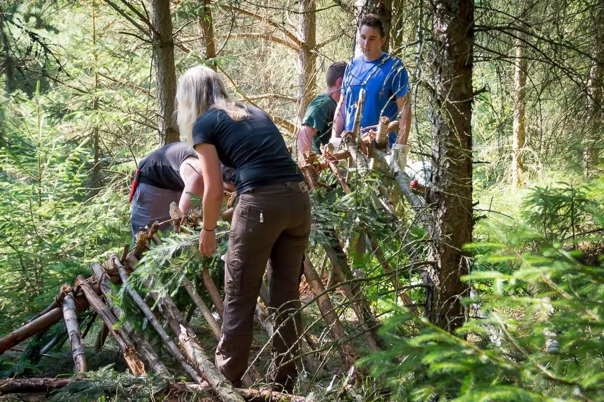 Drei Personen arbeiten im Wald an einer improvisierten Konstruktion aus Ästen und Pflanzen