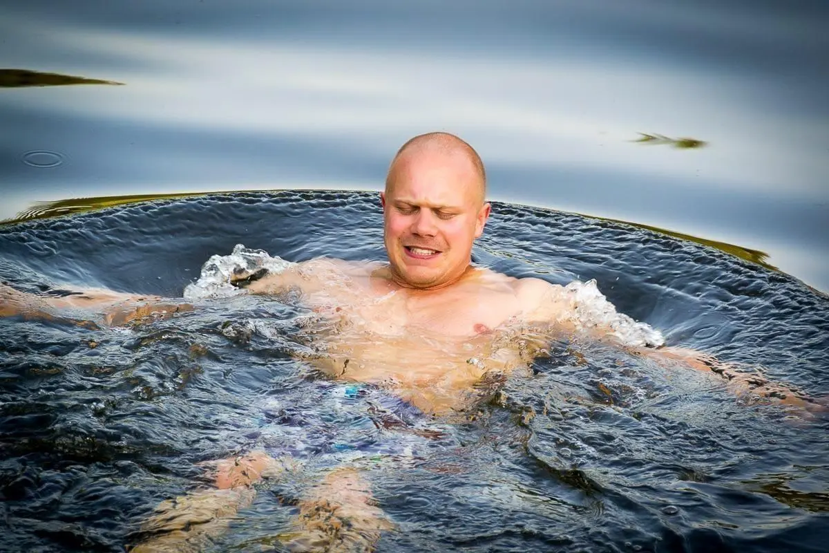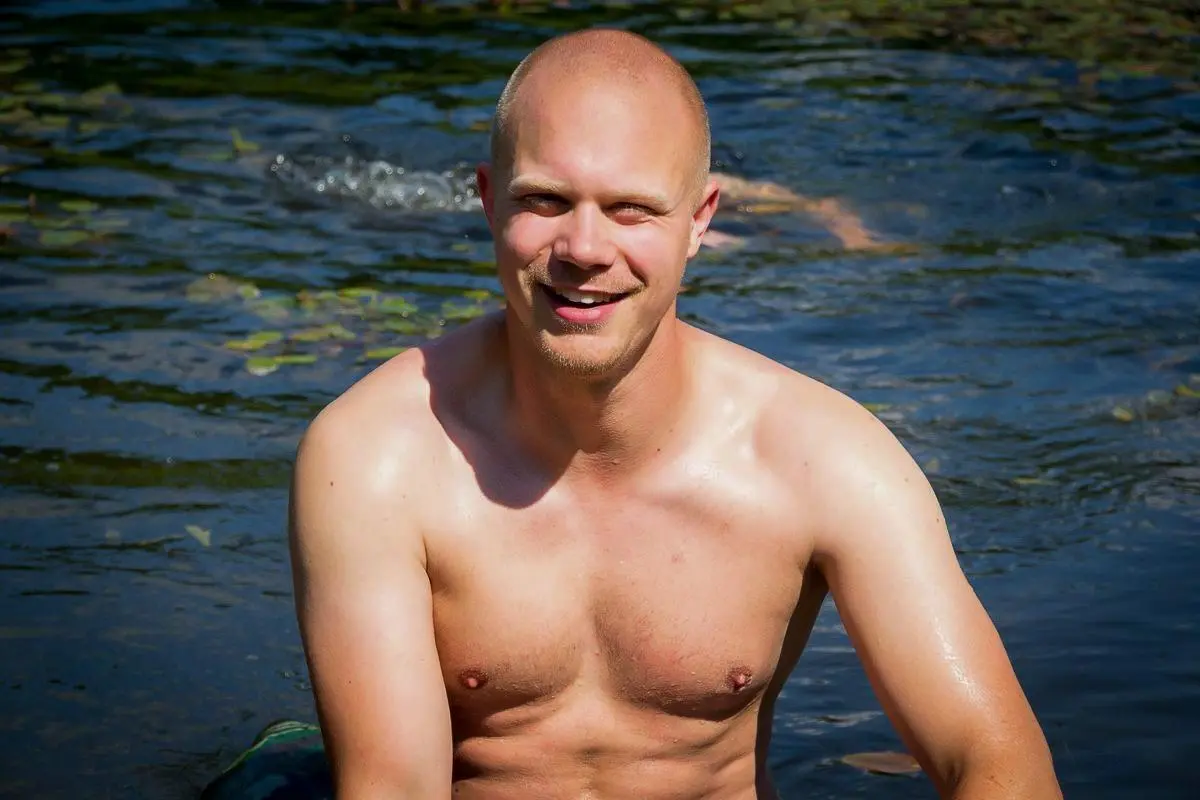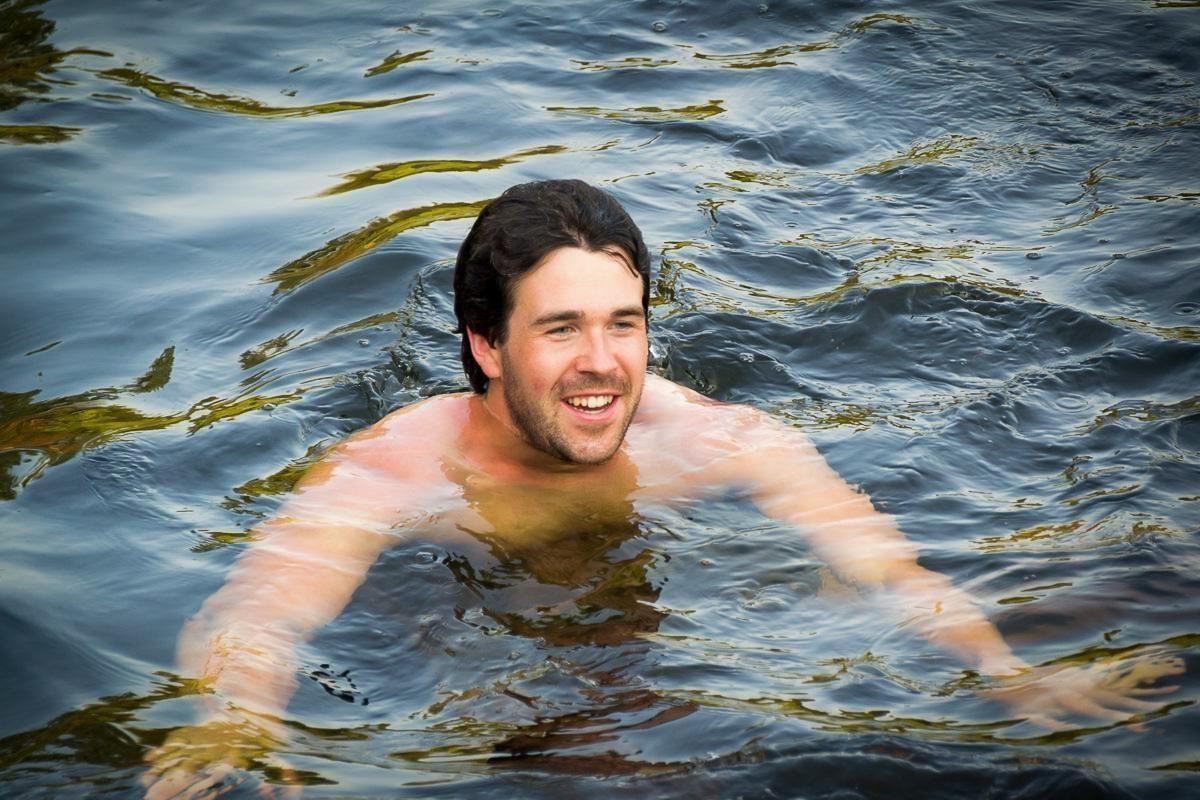 Ein Mann sitzt im Wasser und lächelt, umgeben von Pflanzen