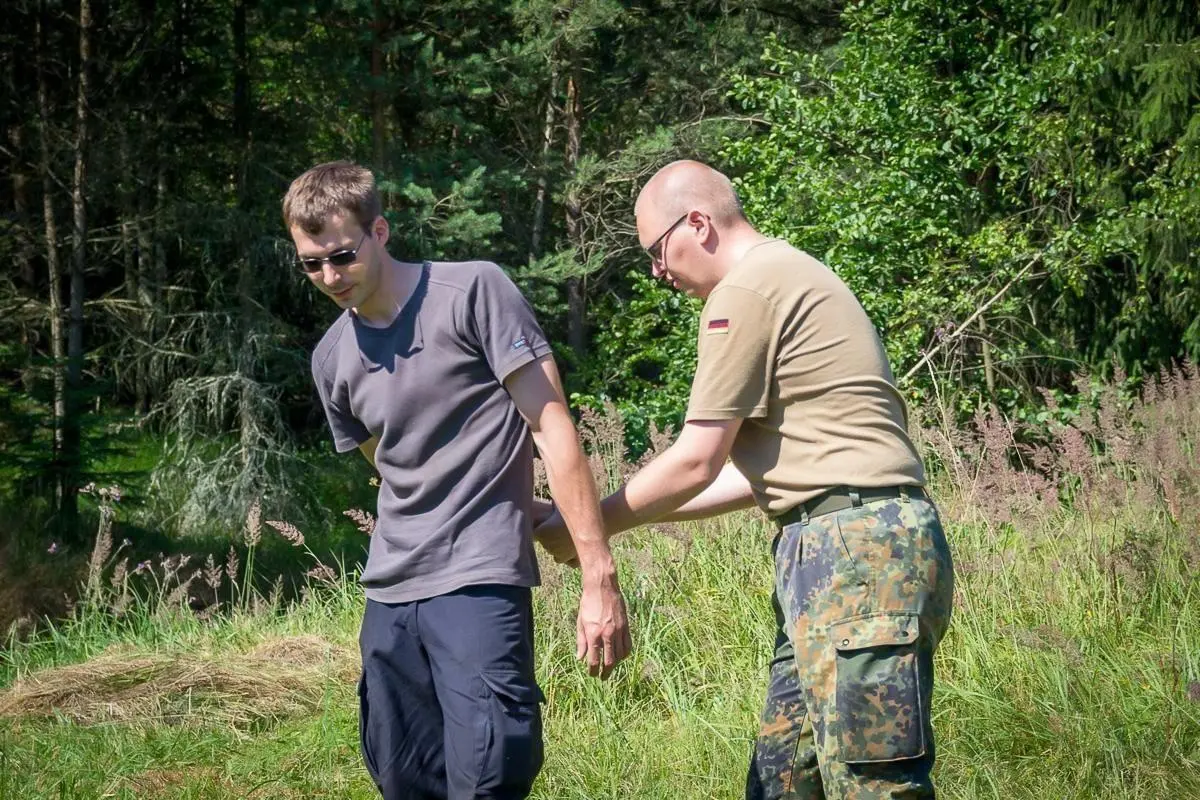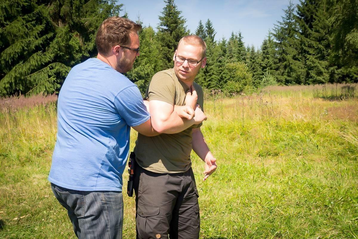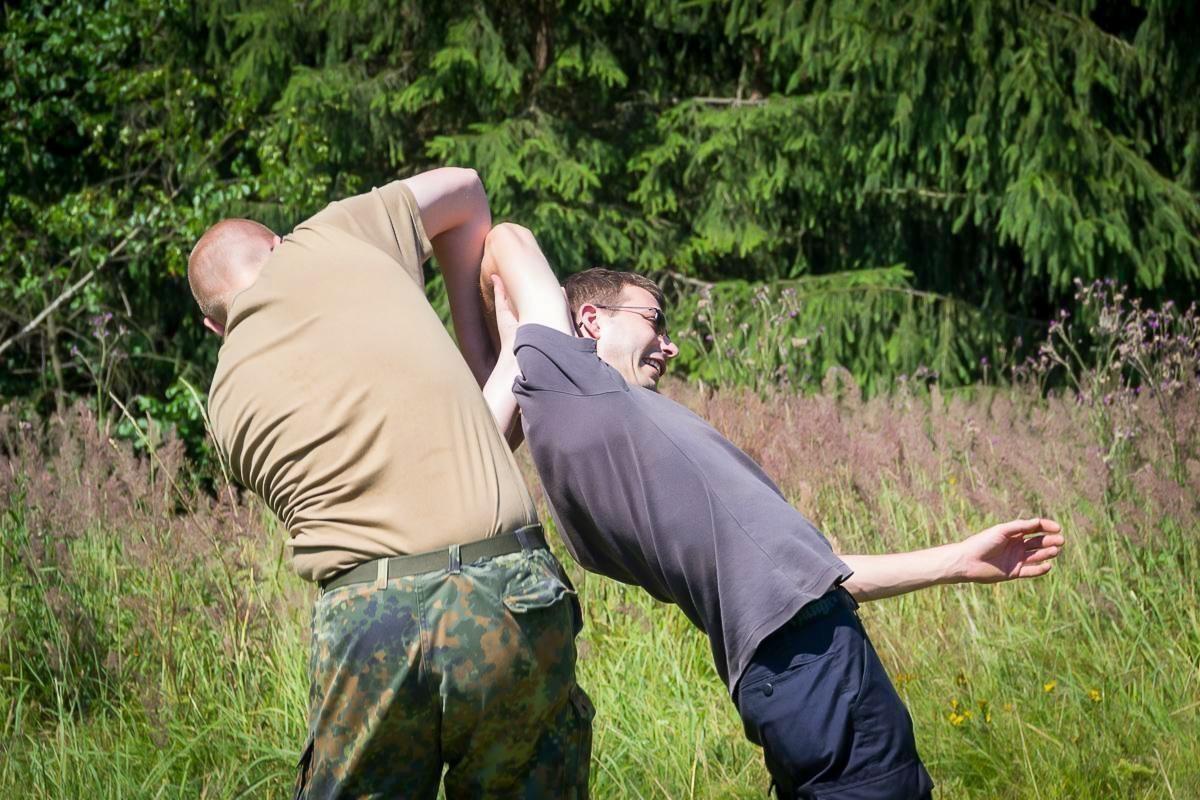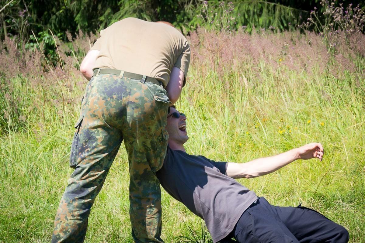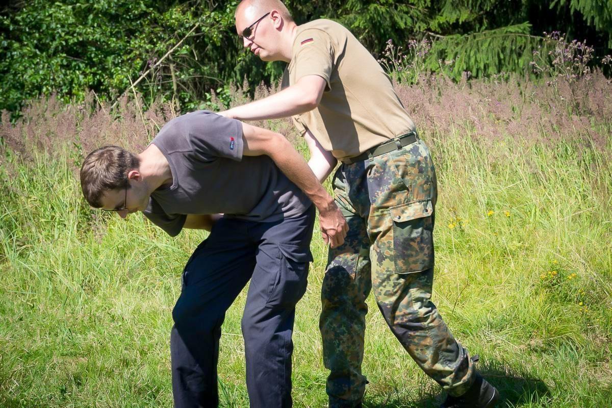 Zwei Personen üben eine Nahkampftechnik im Freien aus