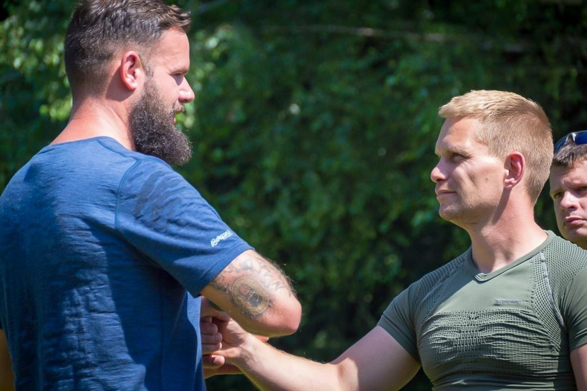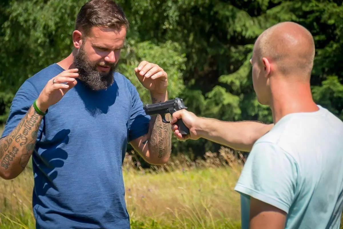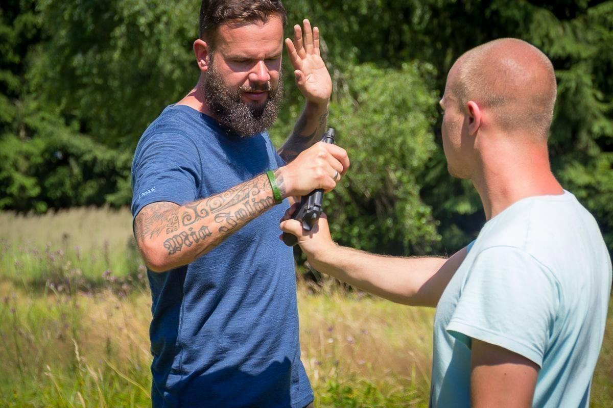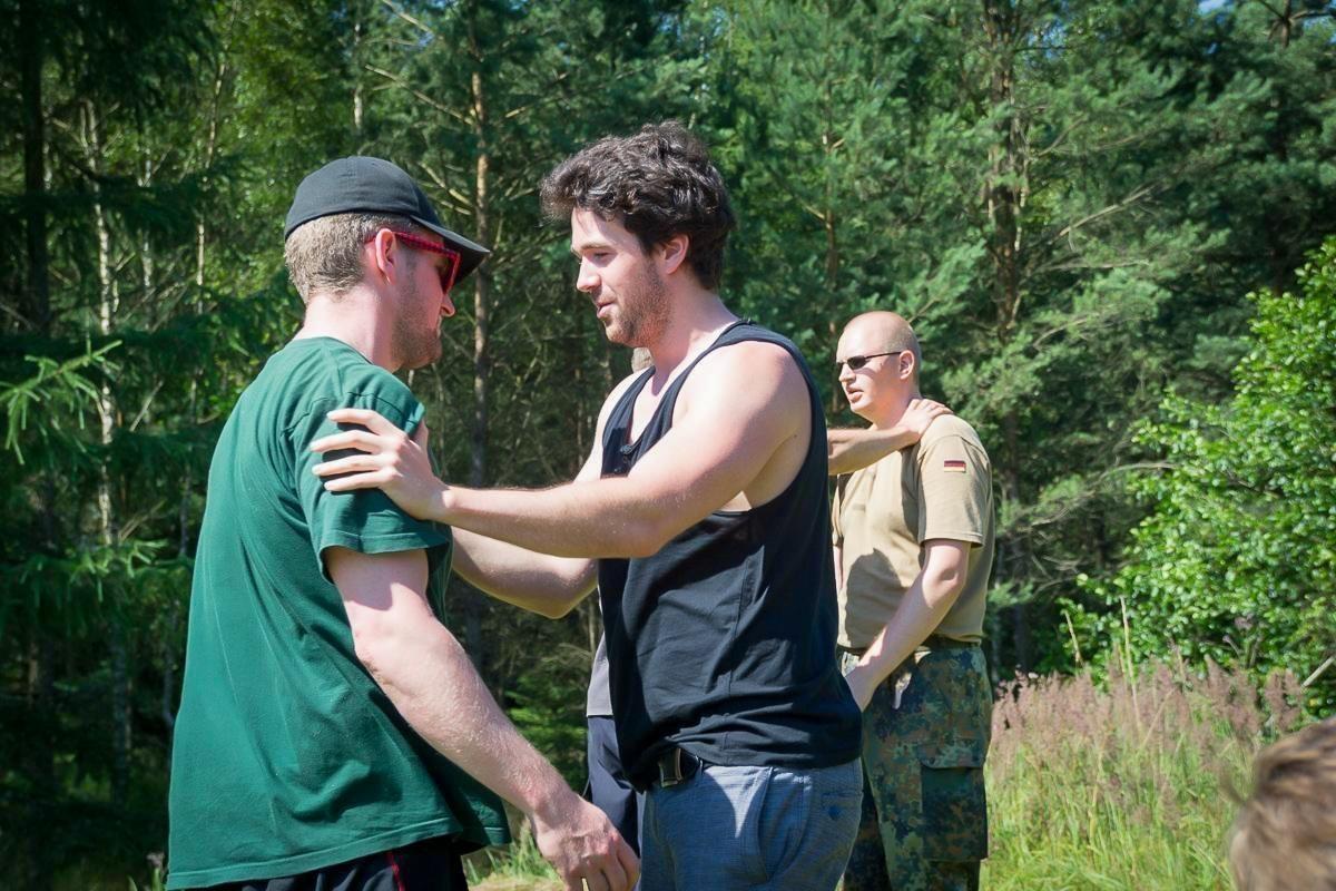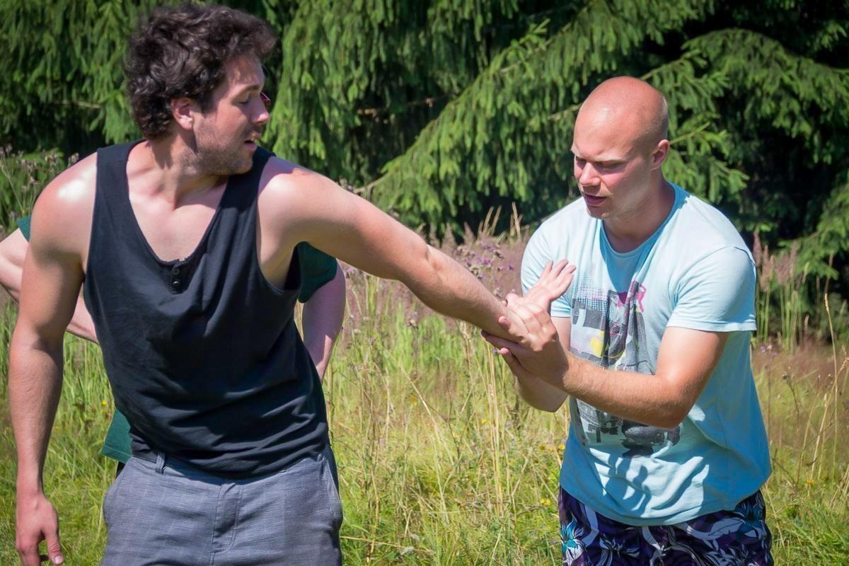 Zwei Personen üben eine Nahkampftechnik im Freien aus