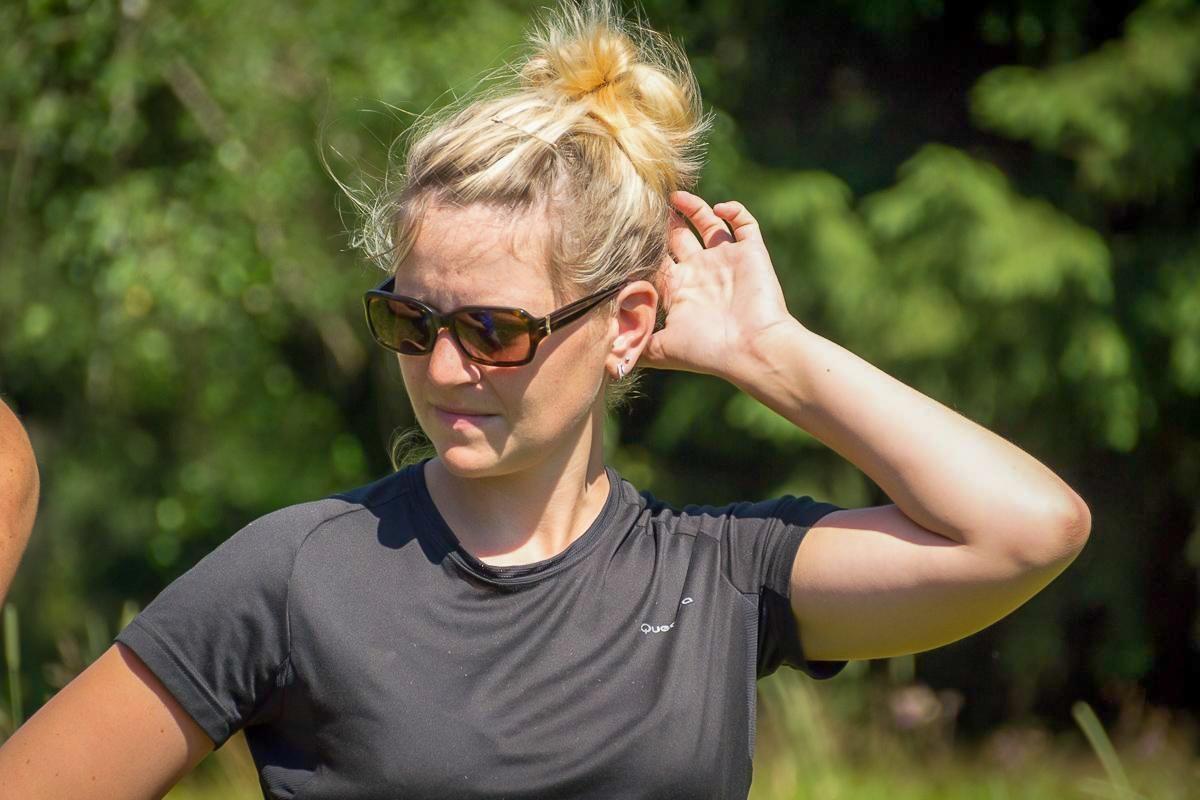 Eine Person mit Sonnenbrille streicht sich das Haar zurück