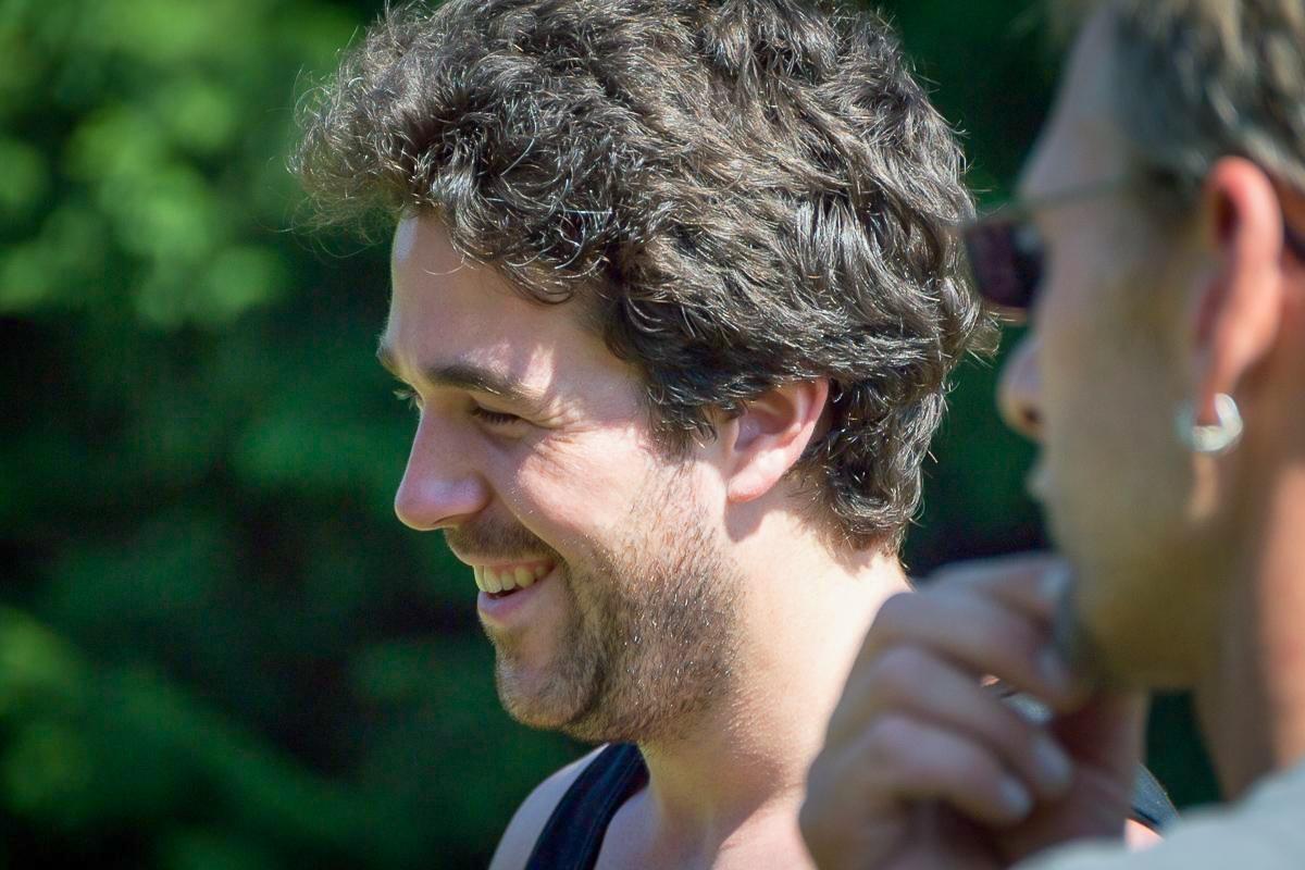 Gruppendynamik im Freien, Teilnehmer stehen in lockerer Runde zusammen