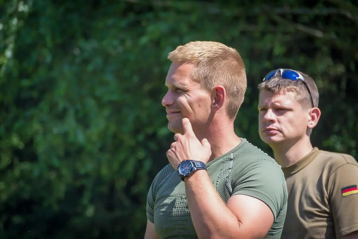 Es sind zwei Männer in militärischer Kleidung zu sehen, einer denkt nach