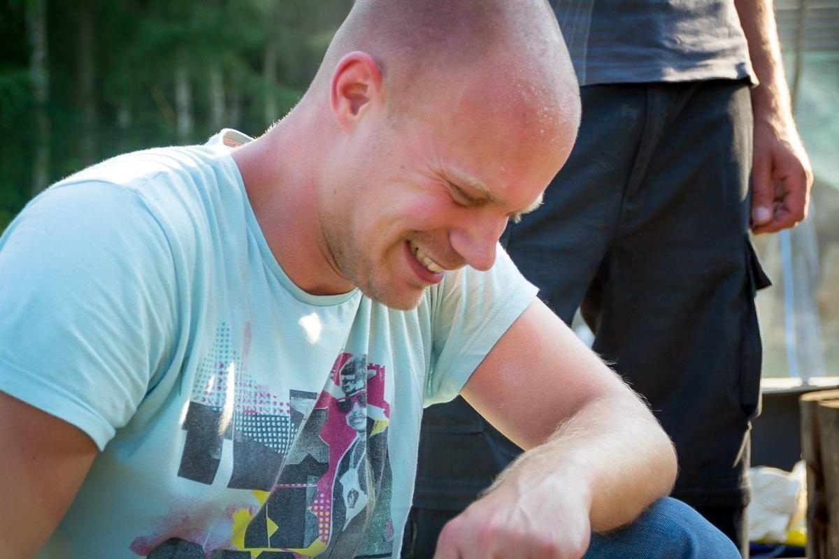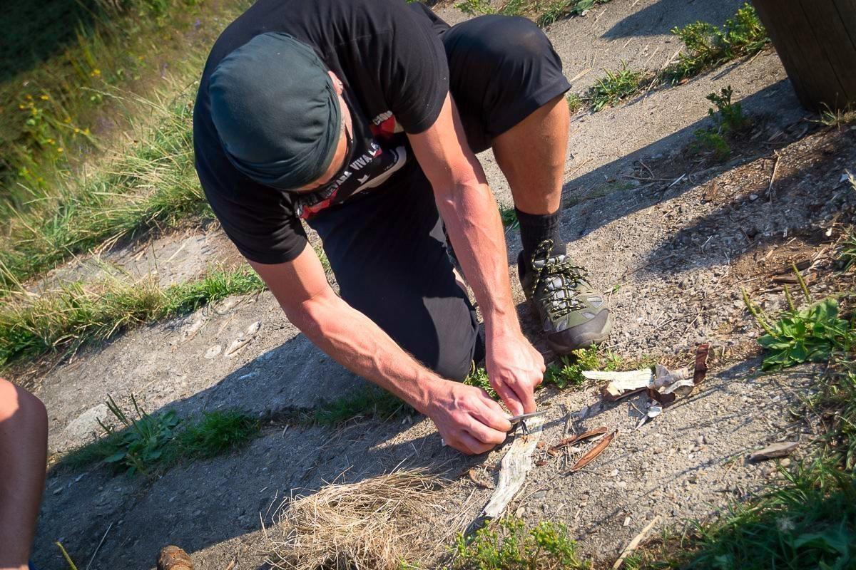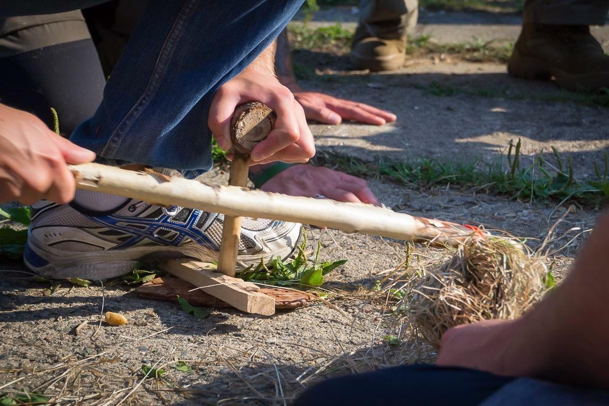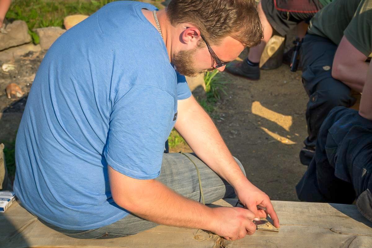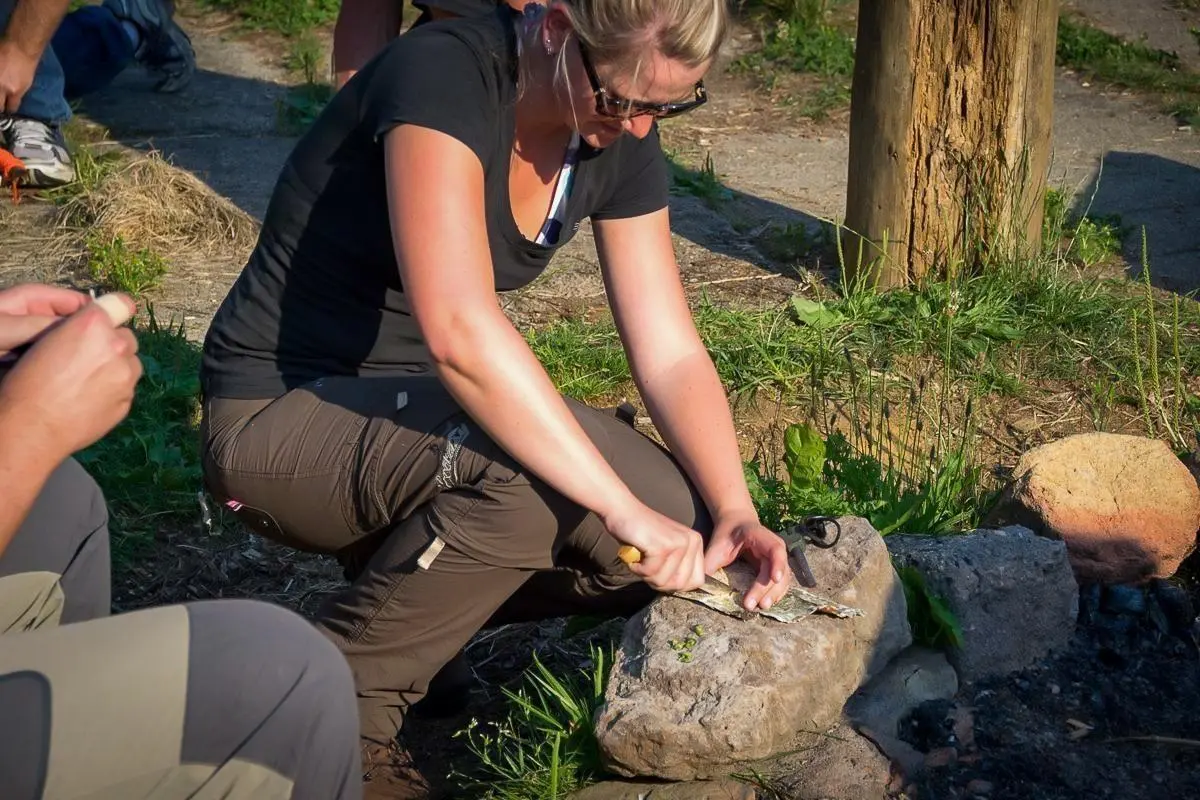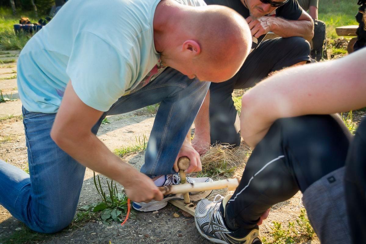 Zunder glimmt auf einem Holzstück, während ein Teilnehmer Funken erzeugt