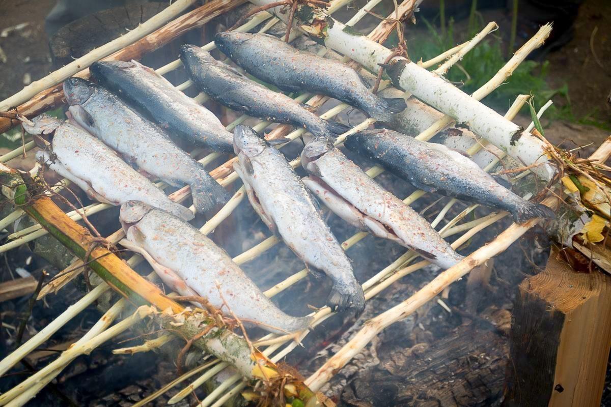 Fische werden auf einem improvisierten Grill aus Ästen geräuchert