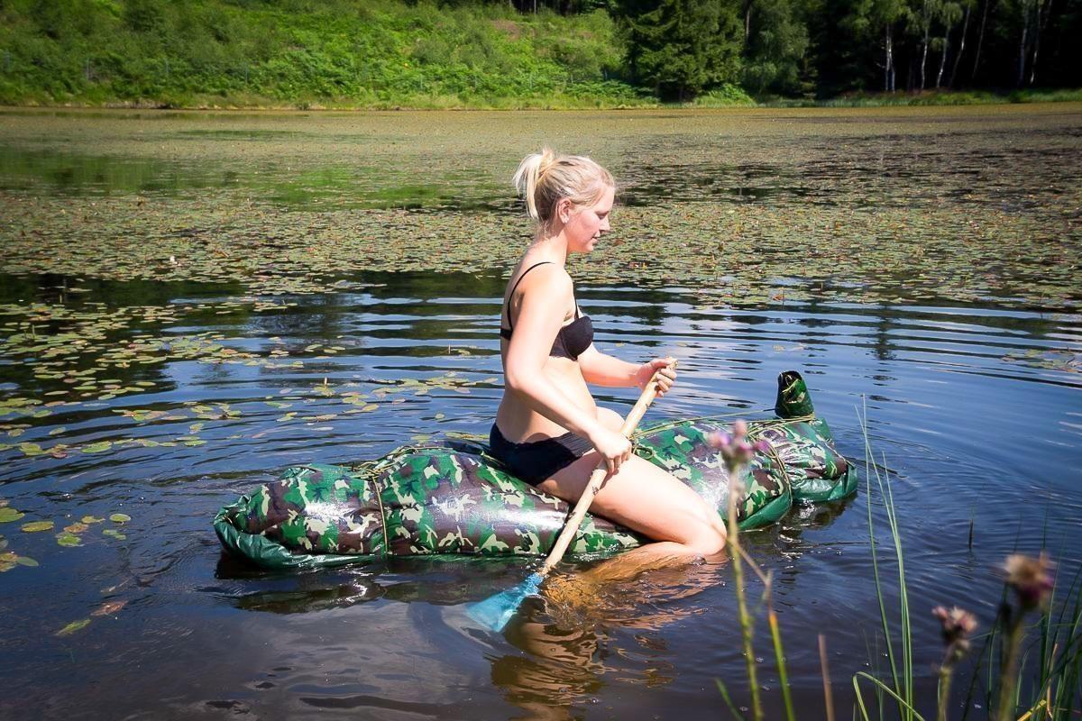 Frau paddelt auf einem camouflagefarbenen Schlauchboot im Wasser