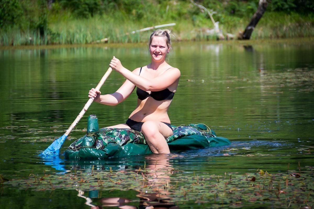 Frau paddelt auf einem improvisierten Floß im Wasser