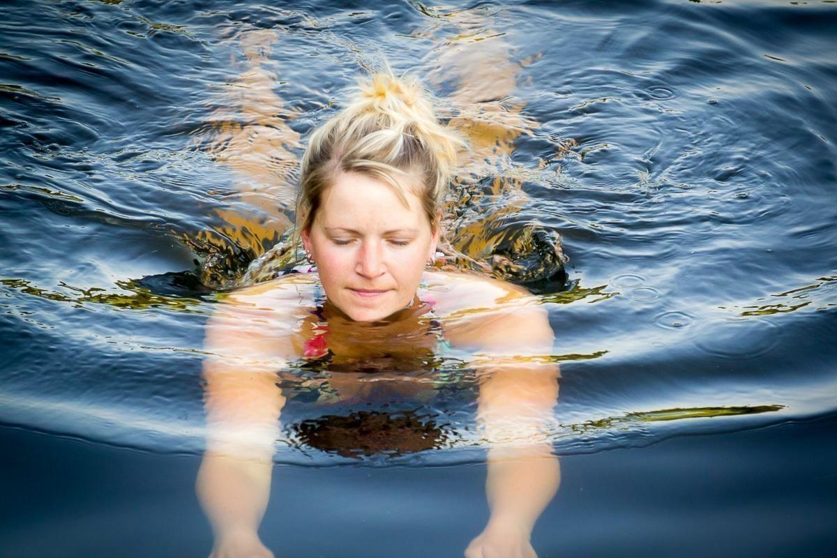 Frau schwimmt mit ausgestreckten Armen in ruhigem Wasser