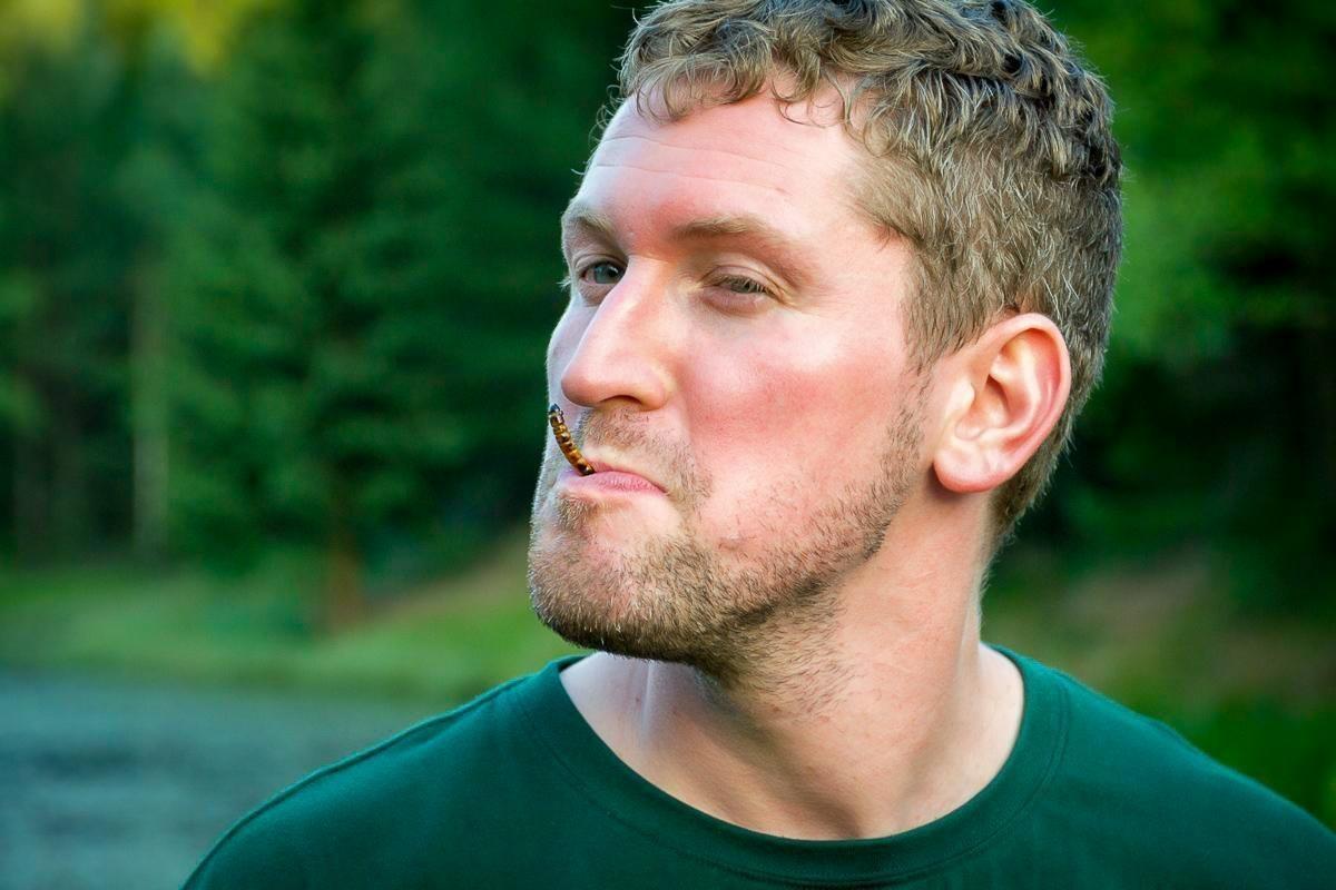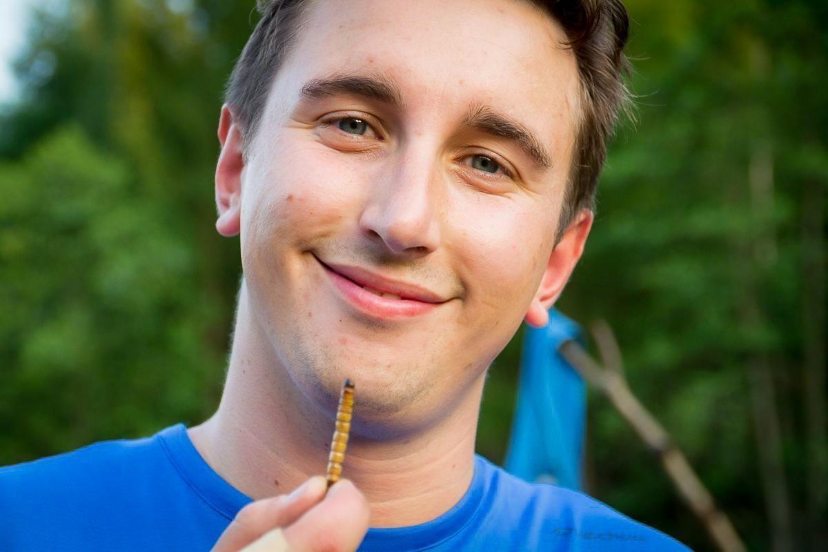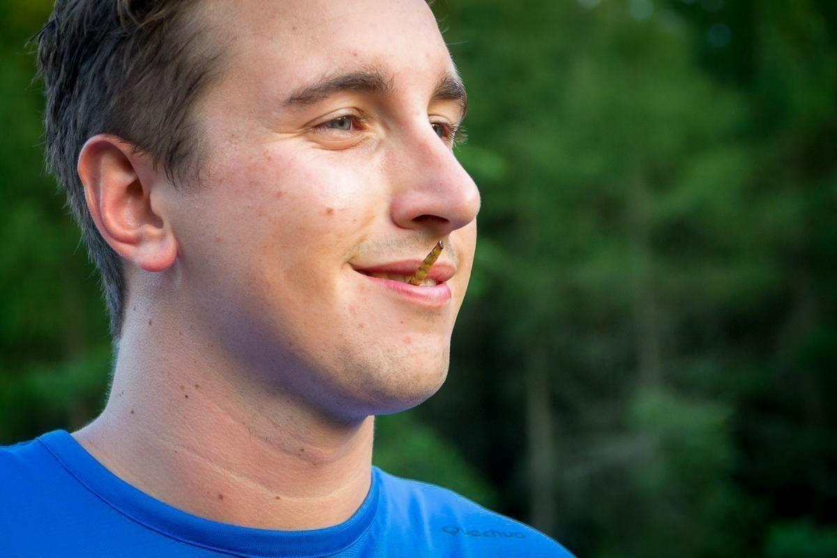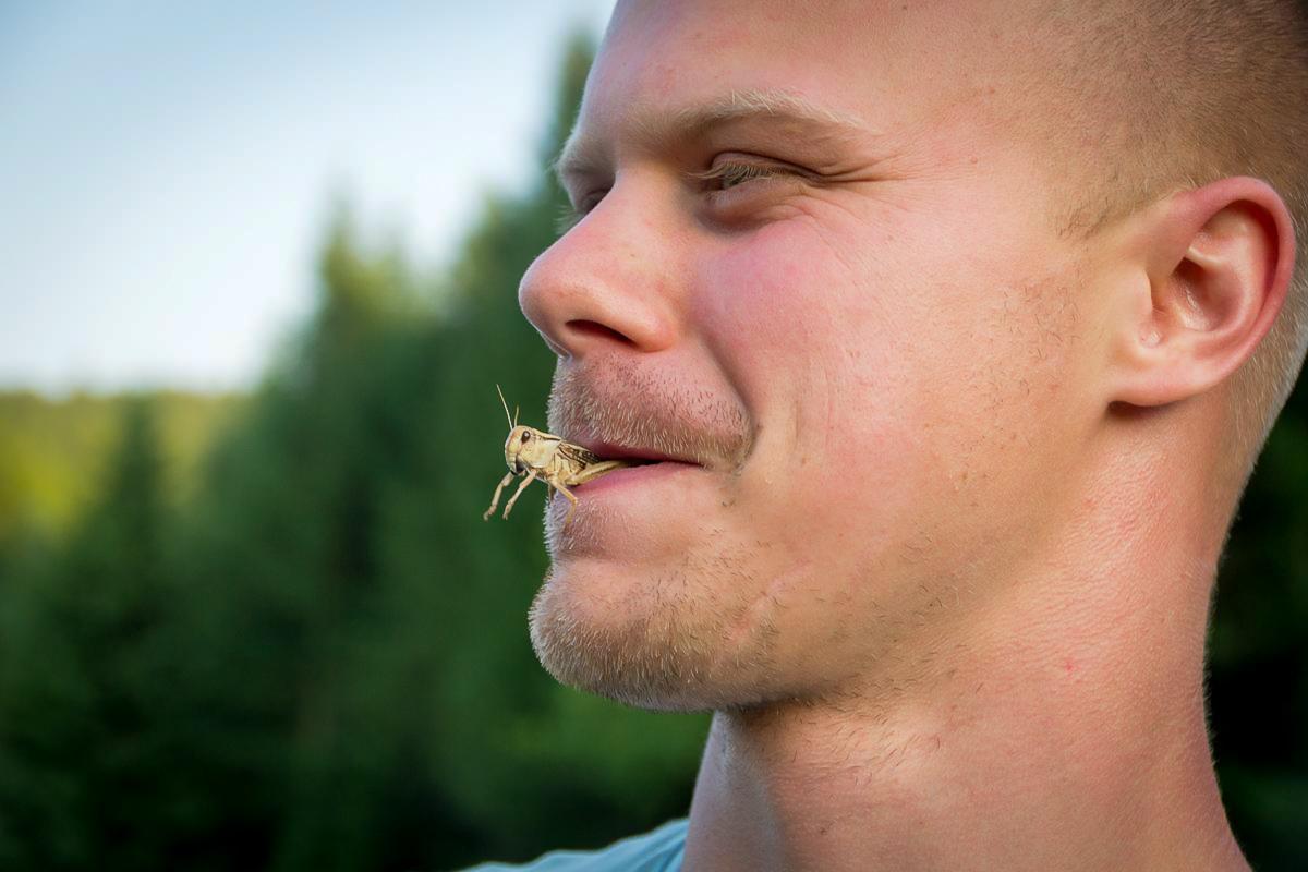Frau hält einen essbaren Insektensnack zwischen den Fingern und lächelt