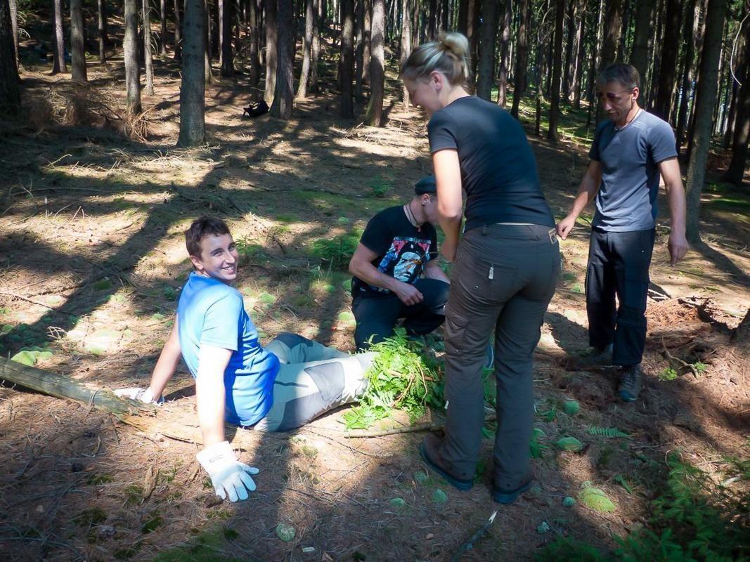Gruppe arbeitet im Wald, einer sitzt auf dem Boden, andere stehen und helfen