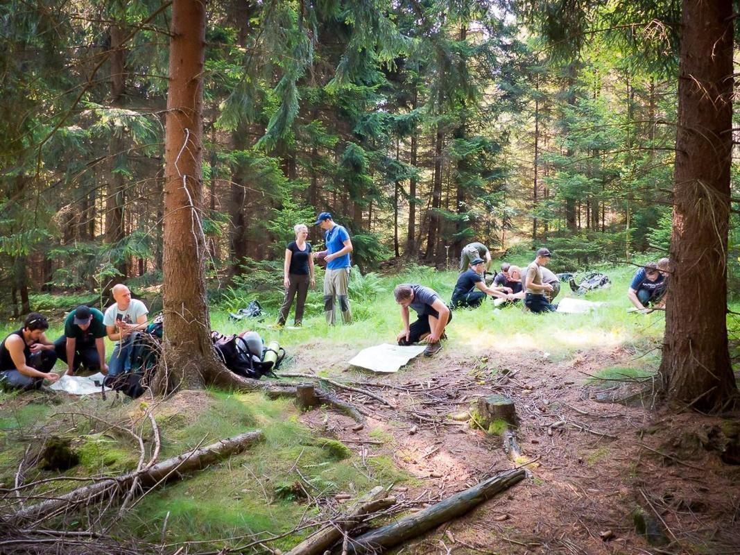Gruppe arbeitet mit Karten und Rucksäcken im Wald auf moosbedecktem Boden