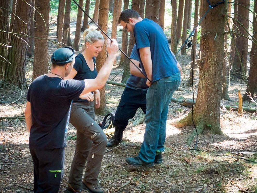Gruppierung arbeitet an einer selbstgebauten Seilquerung zwischen Bäumen