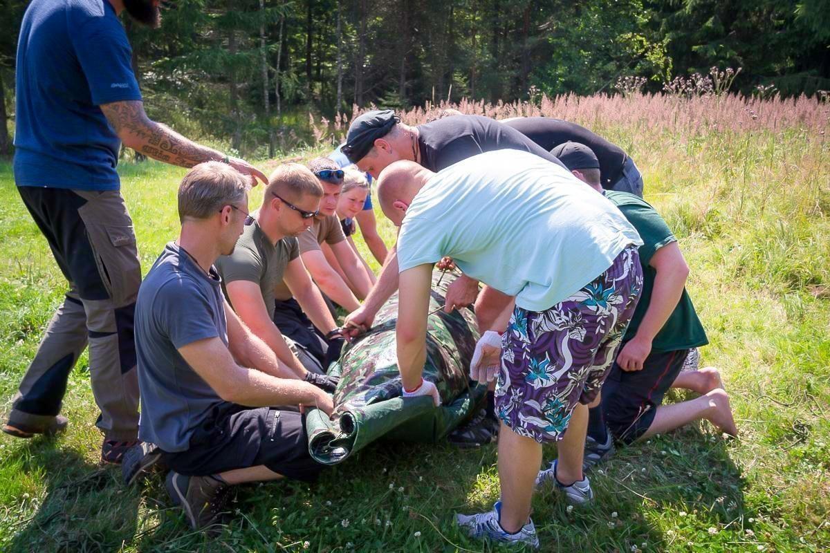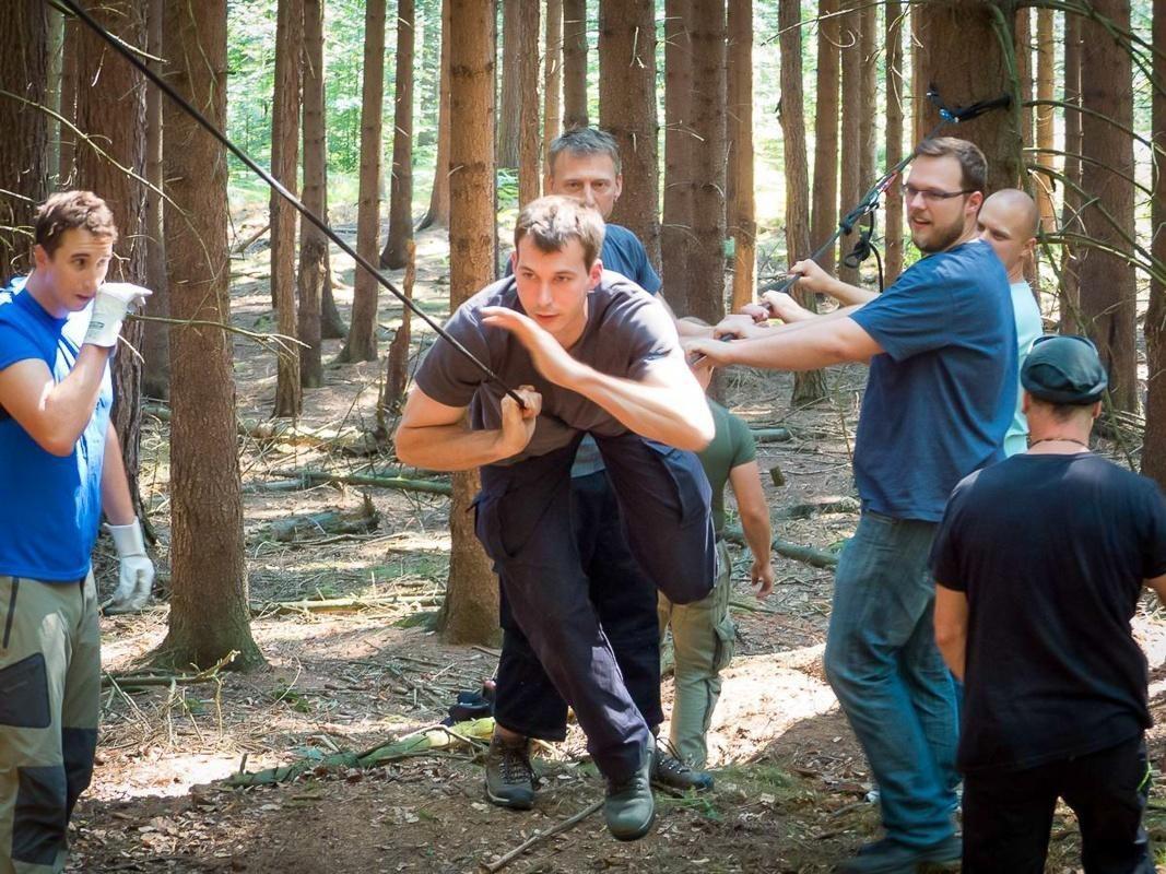 Die Teilnehmer beschäftigten sich auch mit der ersten Hilfe, wobei sie Techniken zum Bergen und Tragen von verletzten Personen erlernten. In praktischen Übungen unterstützten sie sich gegenseitig beim Anlegen von Bandagen und beim sicheren Transport von Personen über Hindernisse. Das Training beinhaltete zudem das Fallenbauen, um Nahrungsressourcen zu sichern. Die Interaktionen unter den Teilnehmern förderten nicht nur das Lernen, sondern auch den Teamgeist.
