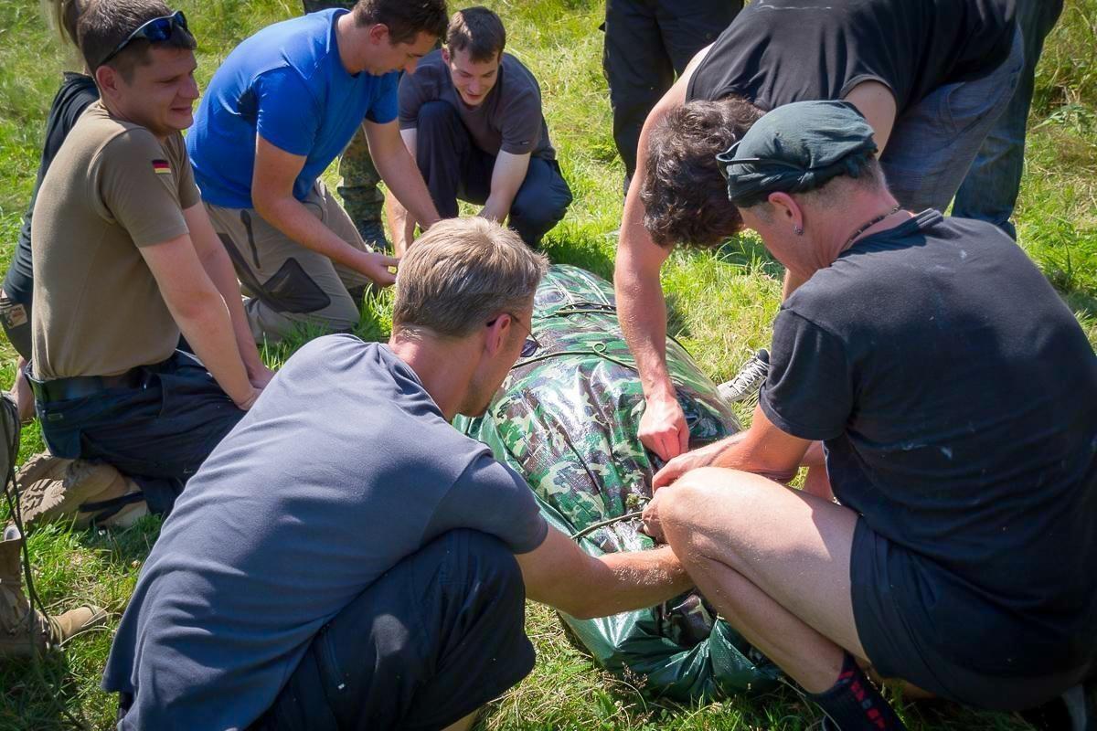 Gruppierung hebt improvisierte Trage mit einer Person darin an