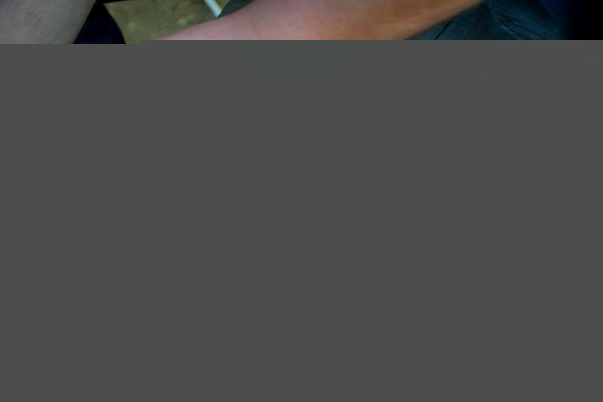 Zunder wird mit einem Messer auf einem Holzstück bearbeitet