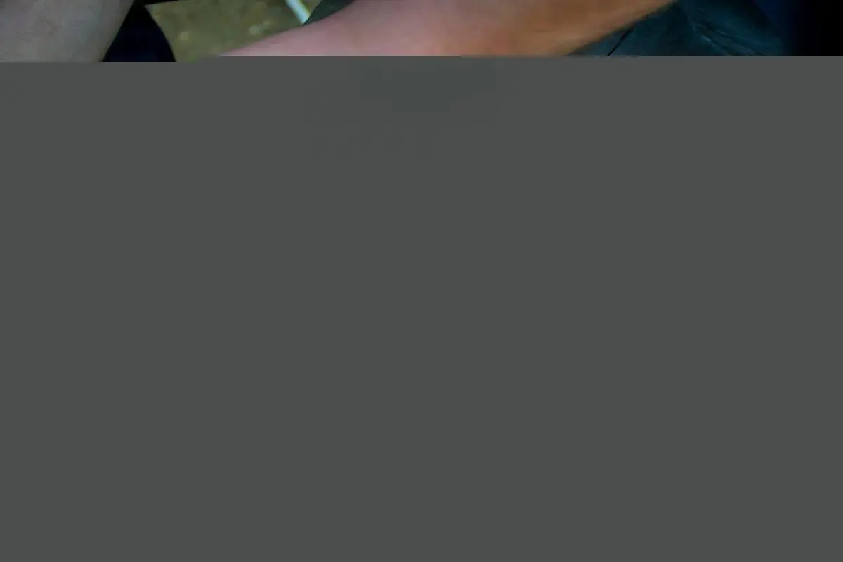 Messer wird an einem Stock gehalten, während im Gras gearbeitet wird