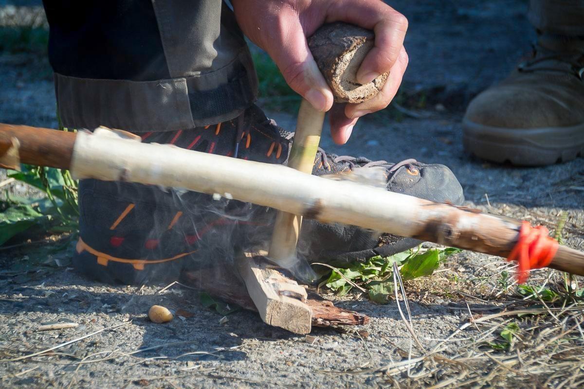 Holzstück wird mit einem Stock bearbeitet, Rauch entsteht durch Reibung