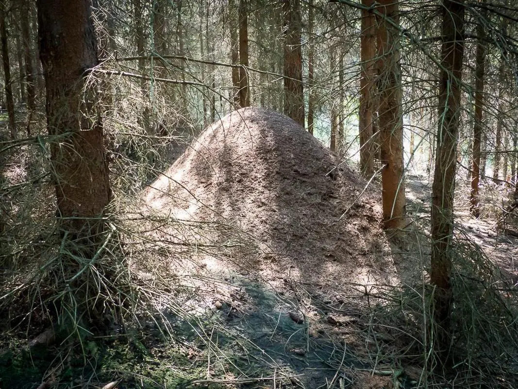 Hügel aus Erde und Nadeln im Wald zwischen Bäumen sichtbar