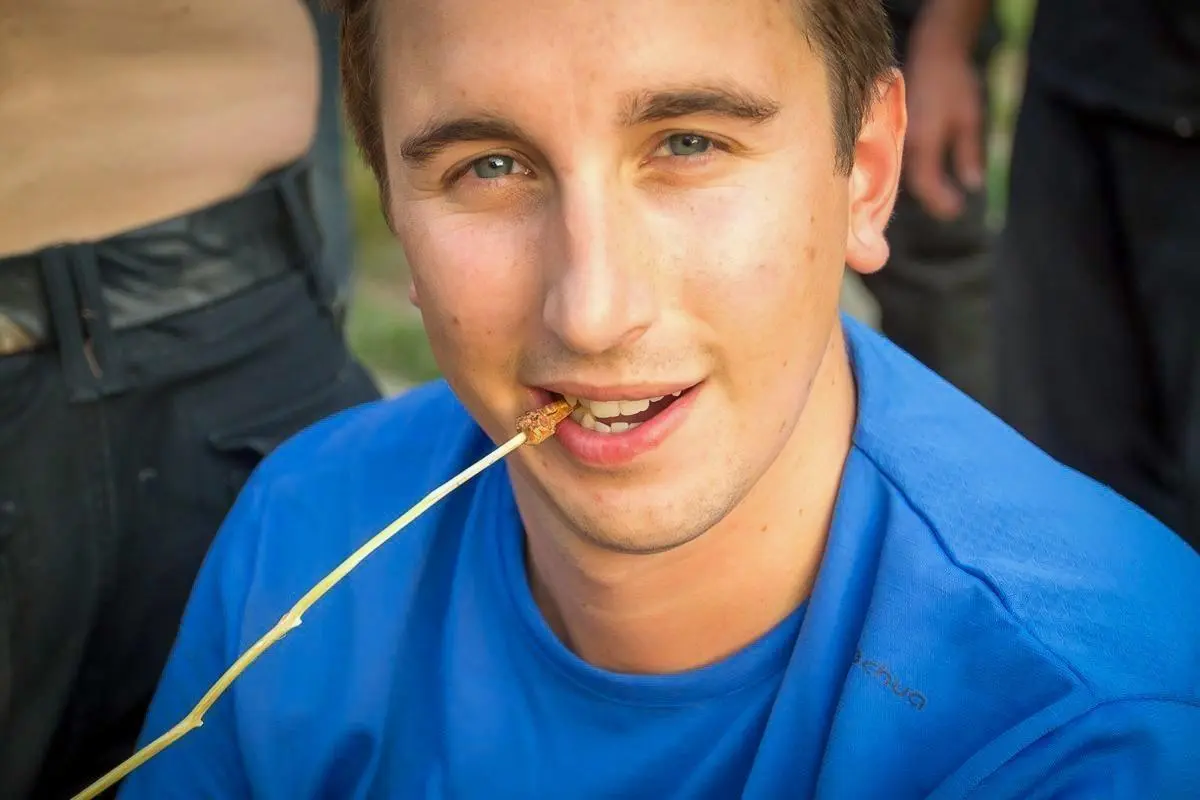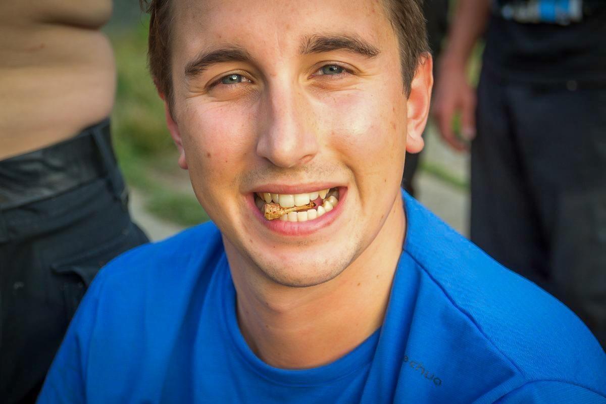 Lächelnder Mann mit einem Snack zwischen den Zähnen trägt ein blaues T-Shirt
