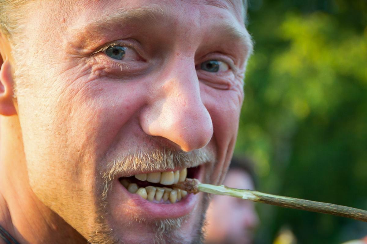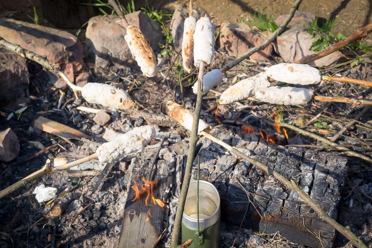 Teigstücke rösten über einem offenen Feuer auf Stockspitzen