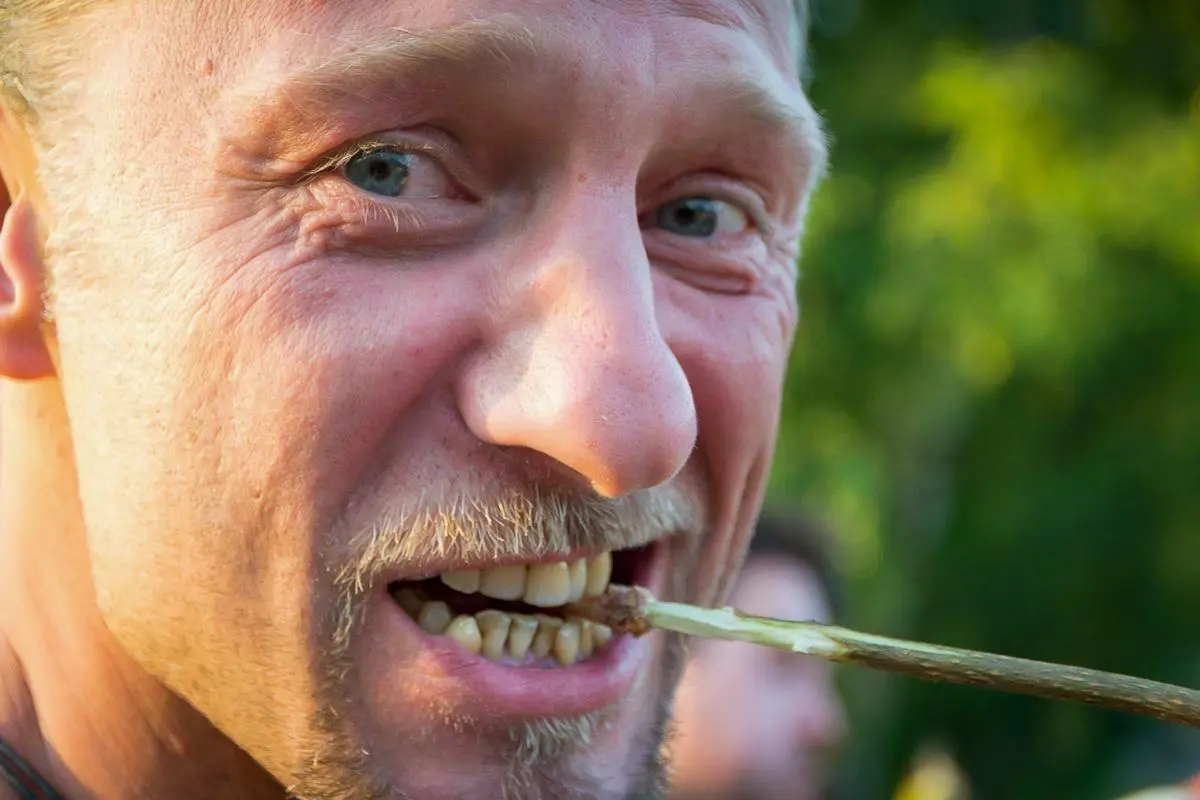 Lächelnde Person hält einen kleinen Snack zwischen den Zähnen