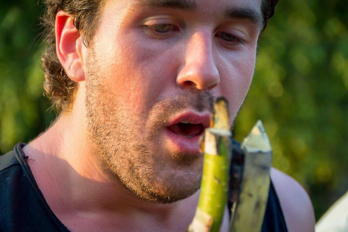 Mann bläst in ein selbstgebautes Blasinstrument aus Holz