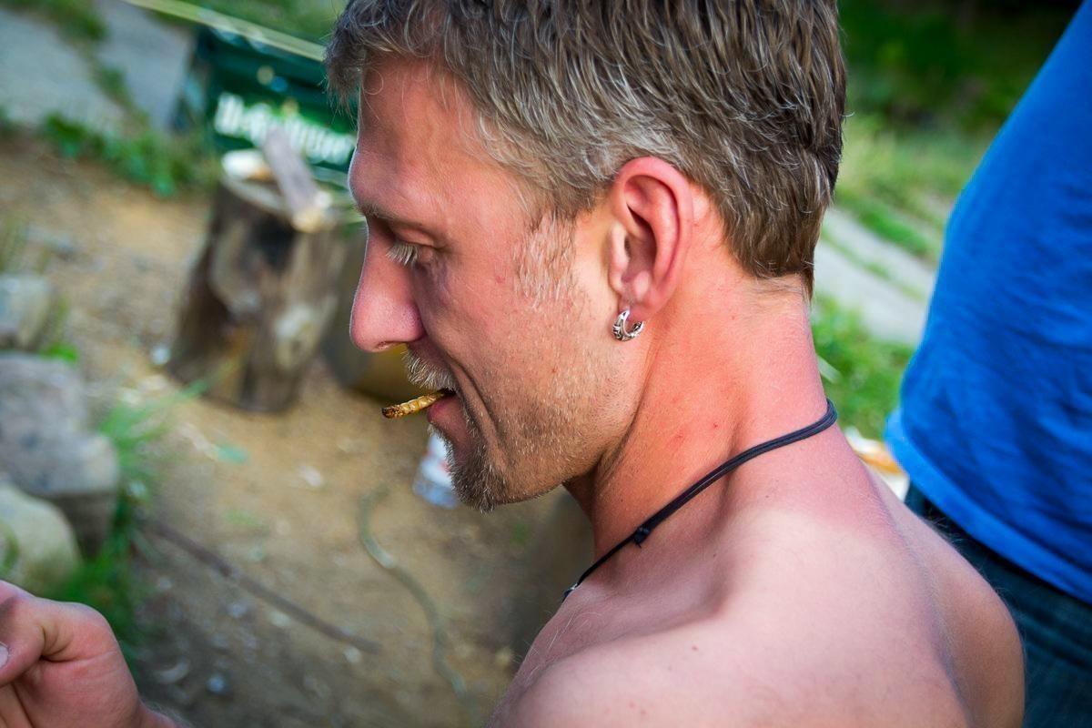 Grille sitzt auf der Lippe eines Mannes im Freien