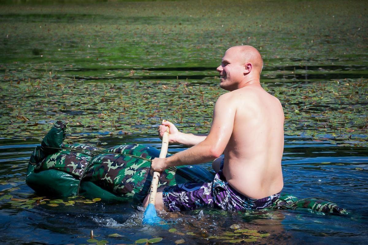 Frau paddelt mit einem blauen Paddel auf einem camouflagefarbenen Schwimmobjekt im Wasser