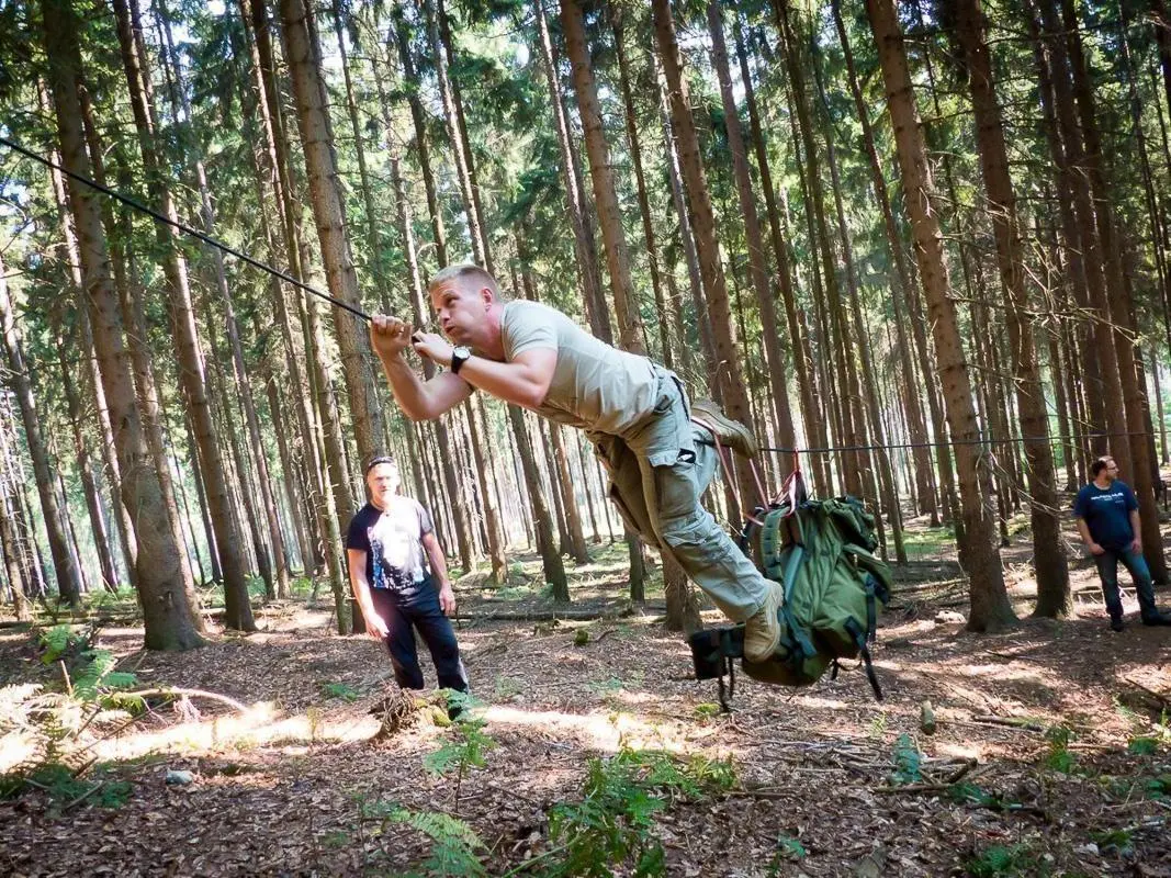 Selbstgebaute Seilquerung wird von einem Teilnehmer mit Rucksack überquert