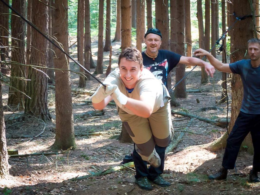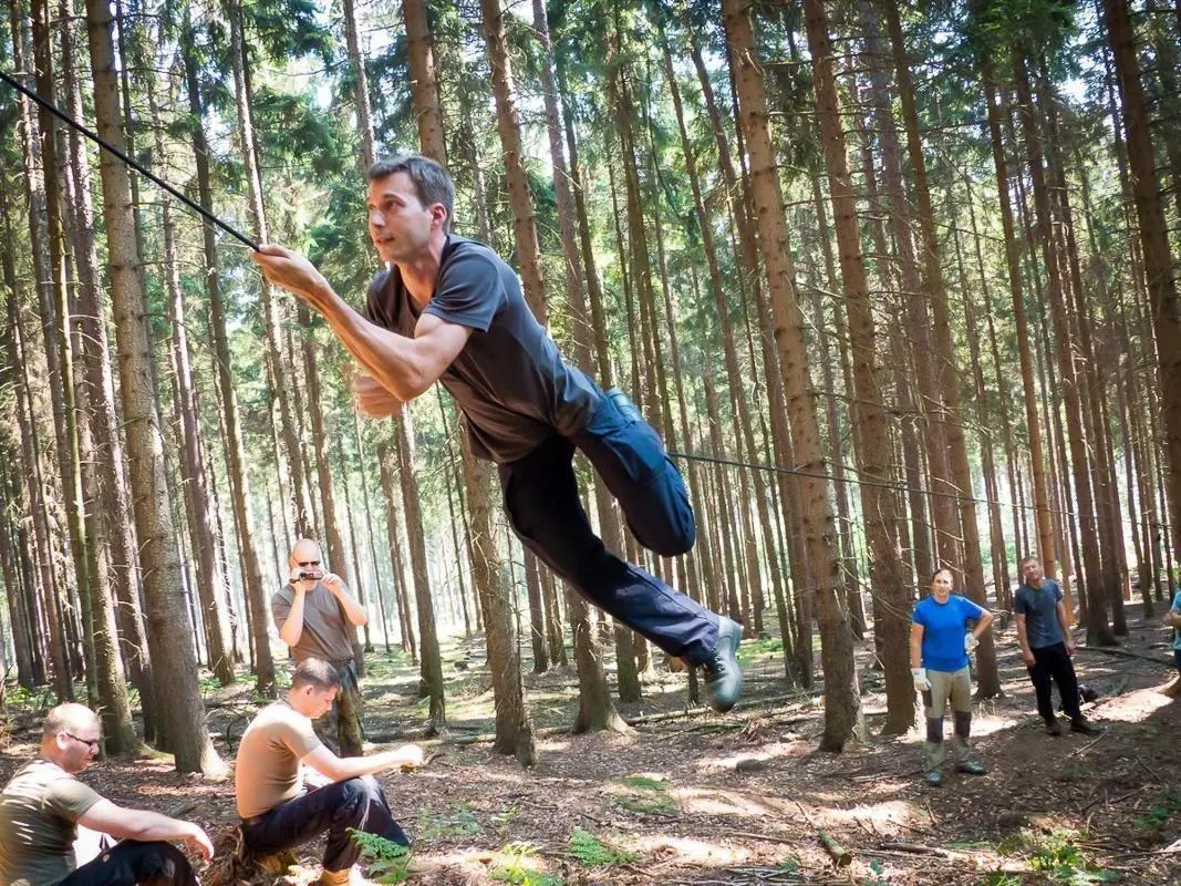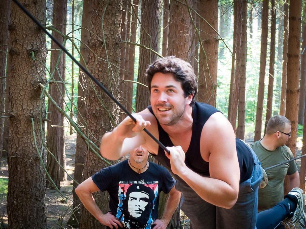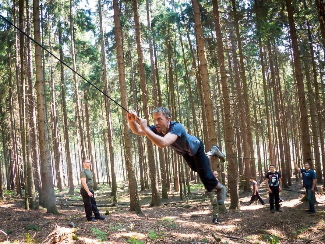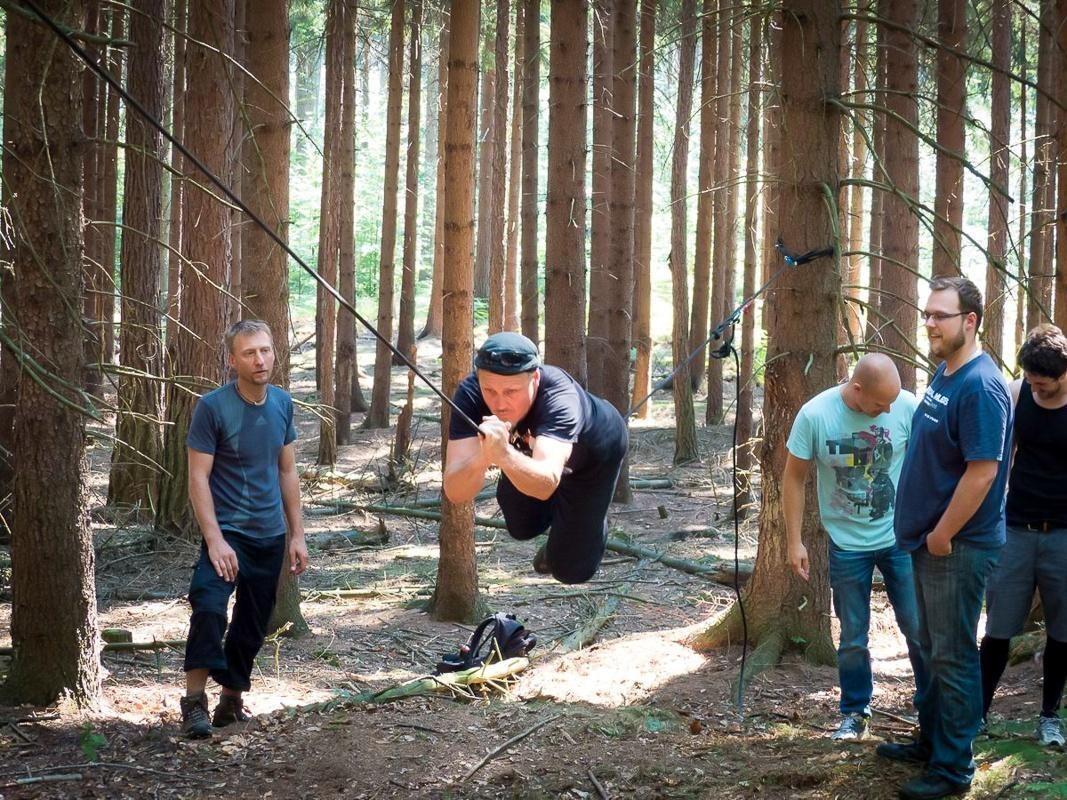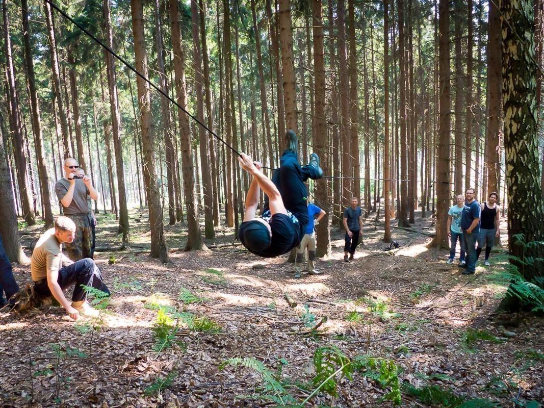 Selbstgebaute Seilquerung wird von mehreren Personen im Wald genutzt