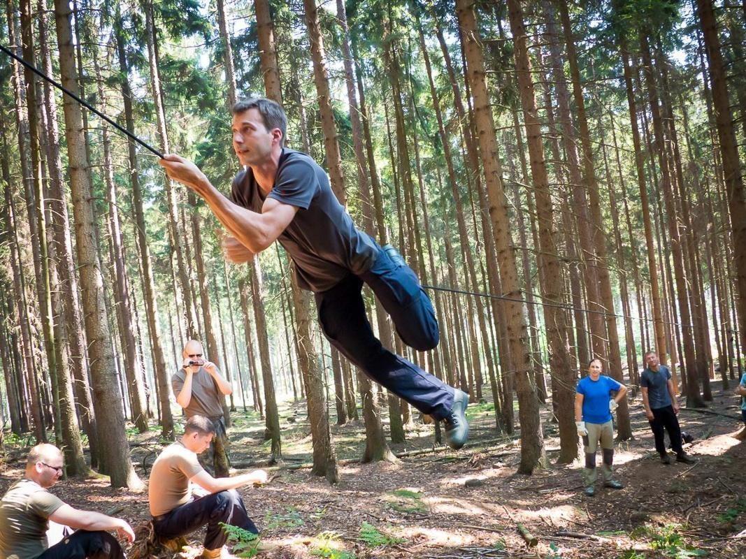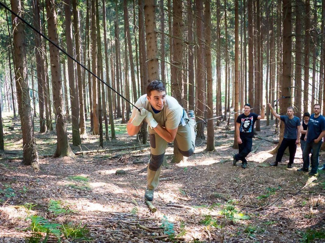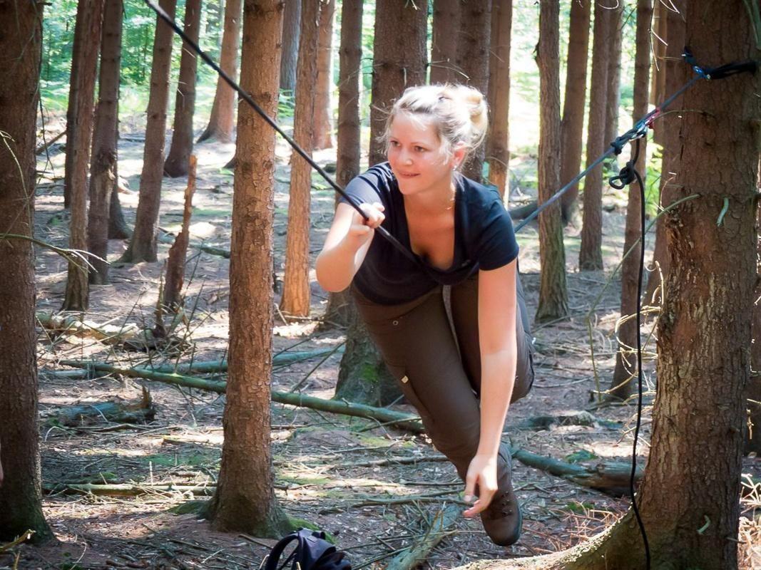 Teilnehmer überquert eine selbstgebaute Seilbrücke zwischen Bäumen