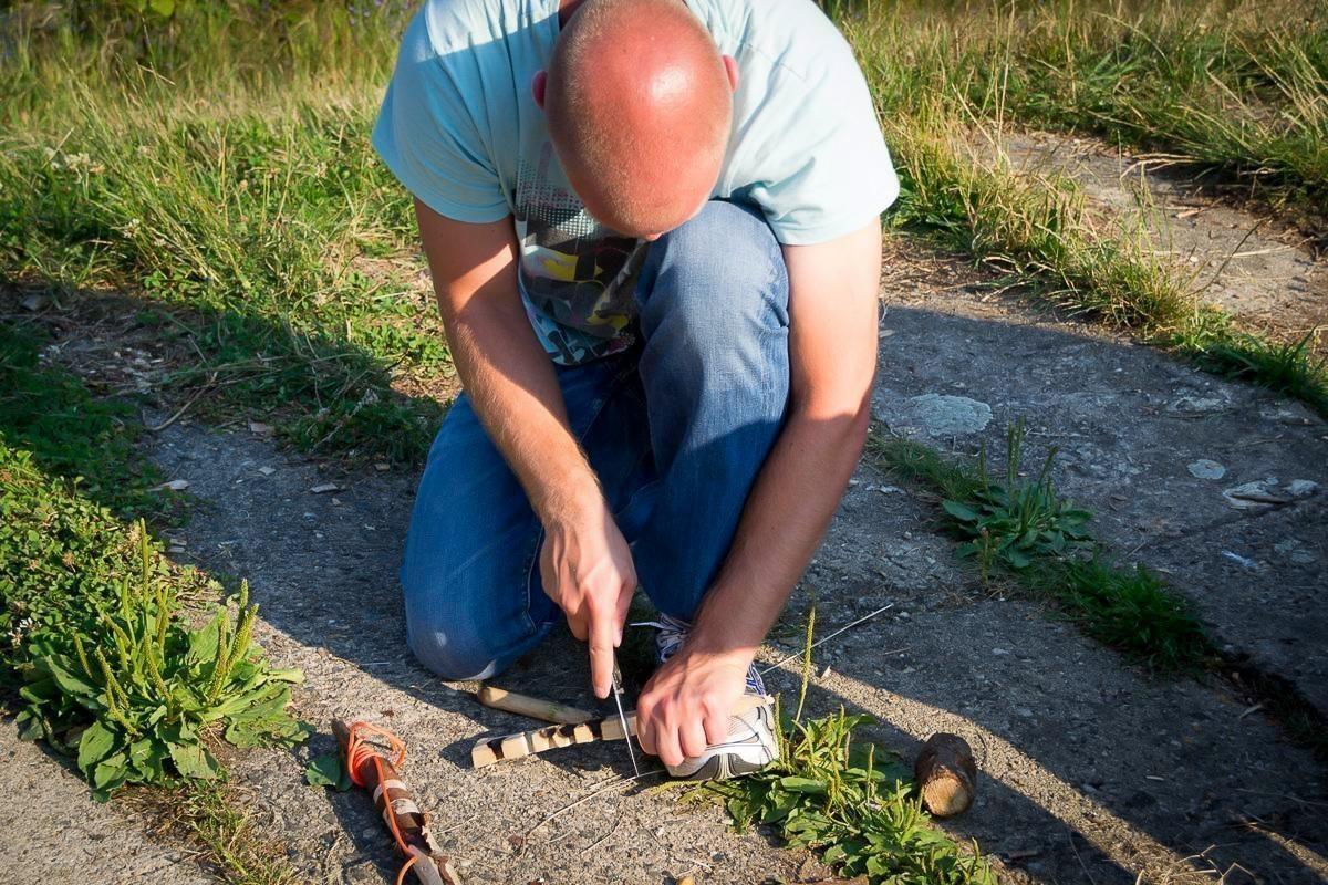 Mann bearbeitet Holzstück mit einem Messer zur Herstellung eines Feuerbohrers