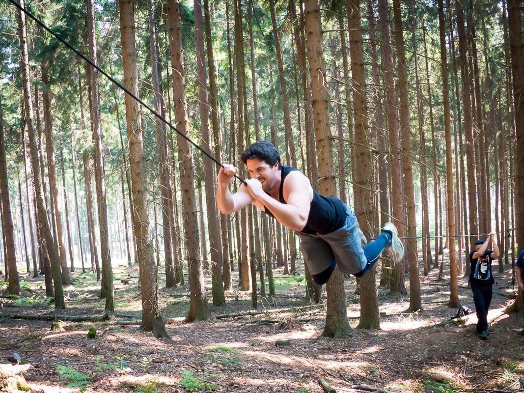 Selbstgebaute Seilquerung zwischen Bäumen wird überquert
