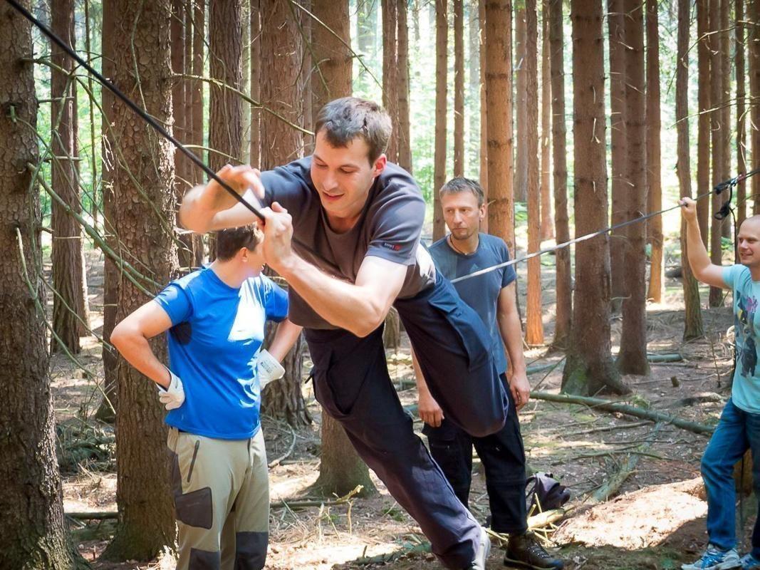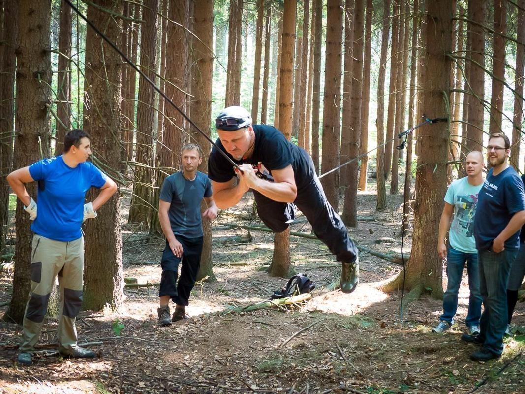 Gruppierung arbeitet an einer Seilquerung zwischen Bäumen im Wald