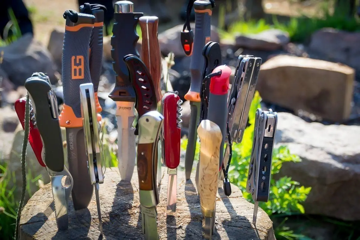Verschiedene Messer und Multitools stecken in einem Holzblock im Freien