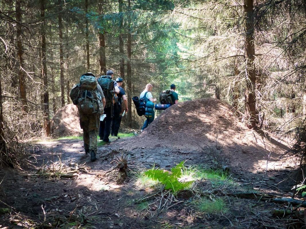 Wandernde Personen mit Rucksäcken auf einem Waldweg zwischen Erdhügeln